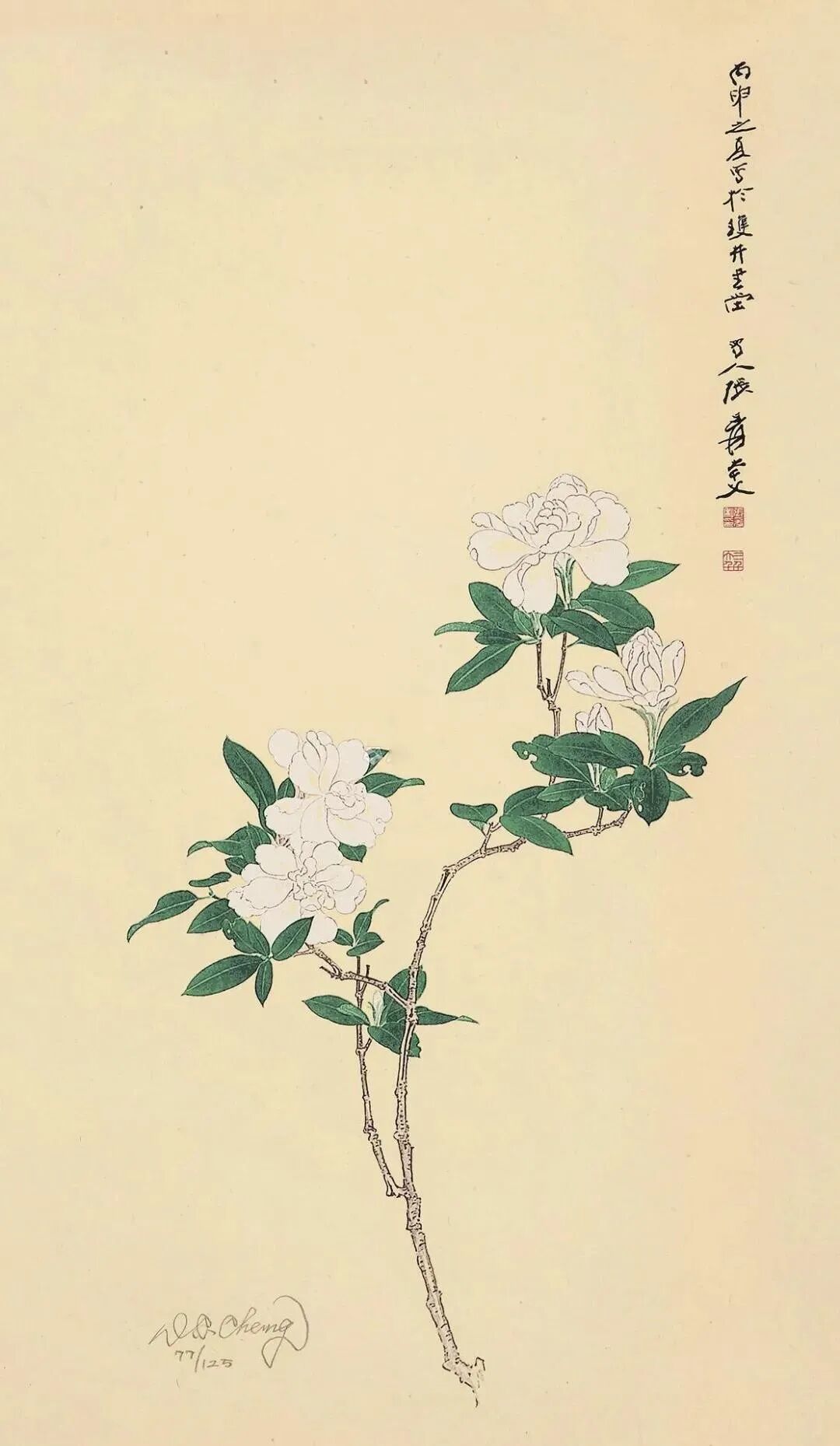 张大千《栀子花开》释文:丙申之夏,写于双井书堂。蜀人张爰大千父。大千曾说“花卉当然要推宋人为第一,画的花卉境界最高。”可知大千画花卉所期望达到的境界。《栀子》全仿宋人折枝写生,枝干花叶皆以细线勾勒而成,不事皴擦,而各得其质感。对栀子花的处理,从花苞到花朵的半开和盛开,大大小小,疏密聚散,朝向四面展姿。此折枝栀子的写实,犹如植物图谱般精确,又能兼得笔墨精妙的趣味,虽出于写生,而实有胜于自然者。