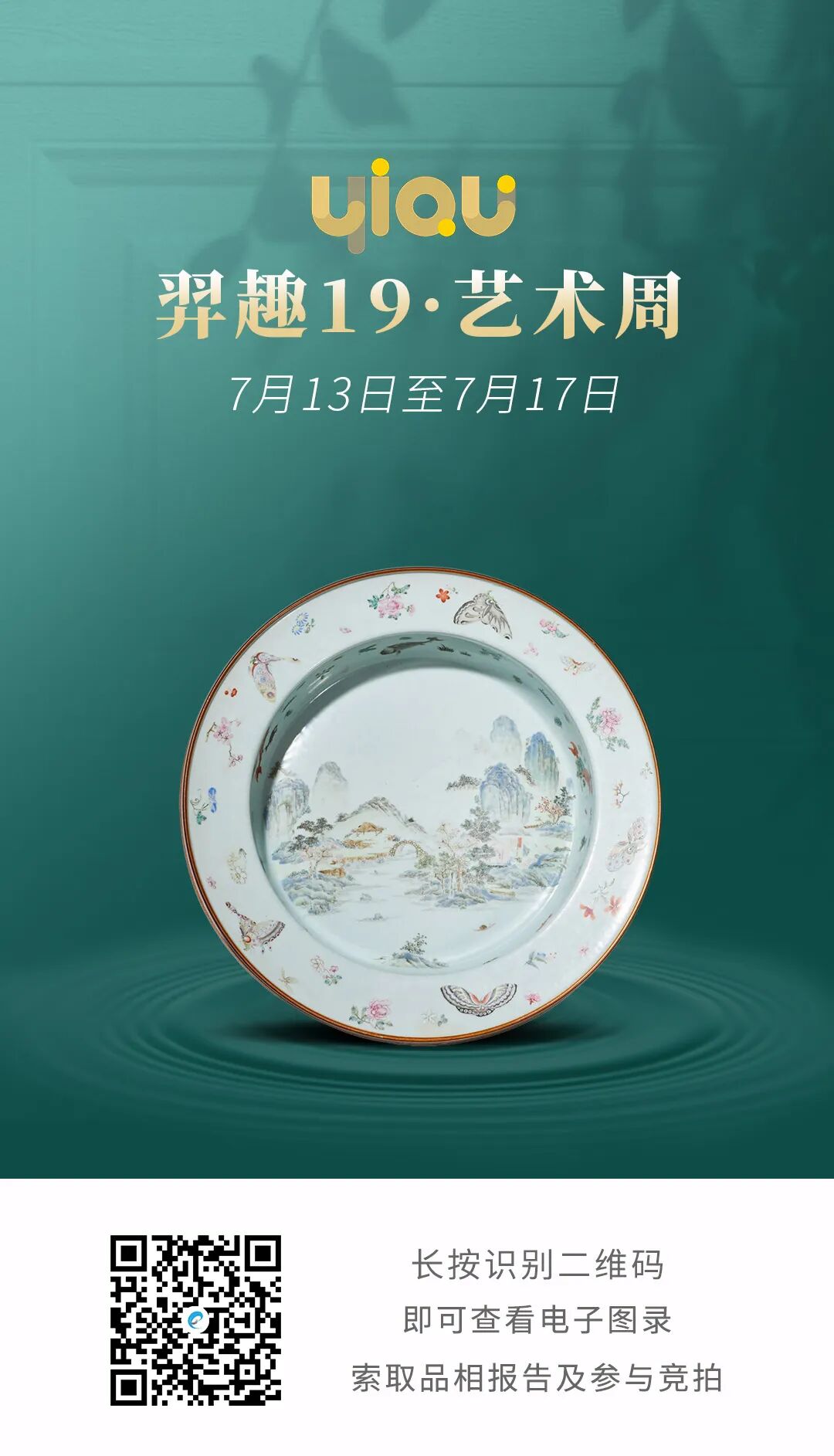 羿趣艺术周是羿趣拍卖在2021年创立的月拍专场,继承了大羿拍卖在明清瓷器领域的专业基因,与此同时,更有珠宝尚品、紫砂、玉翠等多元的门类,网络参拍的方式也更加灵活,打造出了一场又一场兼具趣味与专业性的拍卖盛宴。七月的盛夏季节,新一期的羿趣19·艺术周将于7月11日在羿空间拉开预展帷幕,一众佳器妙作与琳琅精品将为内地沉寂已久的艺术拍卖市场积蓄动能。本次拍卖将呈献五大瓷器工艺品专场,通过不同的拍卖形式让藏家感受身临其境的竞拍体验,更有当代书画、金镶玉、紫砂壶、佛教艺术等多个限时拍专场,满足不同艺术爱好者的收藏需求。联拍在线将全程直播,并提供实时同步竞拍技术和服务支持。7月11日下午3点,羿趣19·艺术周预展导览将在联拍直播间和官方视频号同步播出,敬请期待。瓷器工艺品(一)和(二)专场将为大家呈现各类佳品约260件,官窑、民窑各有精品呈献,全面呈现了数百年来陶瓷艺术的发展演变、审美特质和丰富多样。拍品器形规整,板沿宽阔、弧形壁。胎质洁白滋润,釉面晶莹柔和,白中闪青。口沿施酱釉,外壁以矾红彩饰蝙蝠五只,寓意洪福齐天。板沿面饰以粉彩折枝花蝶图,洗心精绘山水图:青山茂林茅亭驻,远阳红镜扁舟泊。画面中蓝绿彩层次丰富,以表现山势陡峭之感,少量运用褐彩、紫彩点缀山石,为青绿的山景增添变化,色彩搭配富有匠心,或以当时名家的山水画作为粉本绘制。拍品估价:120,000 - 150,000 人民币来源:原藏家70年代初期购于北京工艺品进出口公司(据载)参阅:《故宫博物院藏文物珍品大系-明清织绣》,上海科学技术出版社,2005年,页19,图18漆盒圆形,造型端庄雅正,规整秀致,整体以红漆为地,其上彩漆戗金装饰。盖面回纹开光内绘五爪龙戏火珠图案,飞龙腾空飞舞于云海之上,张牙舞爪,辗转腾挪,雄姿英发,神武撼人,四周祥云缭绕,龙尾趾爪强健有力,穿梭于祥云仙气之间,更显神龙勇猛威严之气。此盖盒之龙纹造型与清乾隆皇帝缂金地蓝龙吉服之龙纹极其相似。盖及盒身亦饰苍龙戏珠纹,姿态各不相同,极富动感,气势逼人,与盖顶图案互为映衬,相得益彰。乾隆皇帝酷爱雕漆,专设造办处承办皇家漆器制作,全器髹漆厚重,造型精致,做工精细,刀法快利,锋棱显露,既典雅又不失雕巧。做工讲究,章法规矩,而以红漆填彩龙纹作主题纹饰,无论大龙小龙均为五爪,档次规格极高,应为宫廷御用之器,弥足珍贵。雕填漆为漆器制作工艺的一种,即在漆器上雕刻花纹,然后沿着花纹轮廓勾出阴文线,于刻纹处填以彩漆。此类填漆有两种制作方式:一是填彩和漆面相平;二是雕填后花纹凹陷,不与漆面平,显出刀刻味,这两种工艺方式均盛行于明清两代。拍品撇口,深弧腹,圈足,器形敦厚规整,外壁以矾红彩为底色,留白处衬绘缠枝花卉纹,绘画纹饰流畅,布局严谨,釉色浓艳。其制作工艺乃先烧成白釉碗,再于上施矾红彩作为底色,并留下白釉为花纹;白釉内以矾红彩线条勾勒花茎,纹样十分精细。整器造型优美,胎质坚实,釉色妍丽,绘画流畅,笔触细腻,诚为佳作,值得典藏。拍品敞口微撇,浅弧腹,圈足。满施白釉为地,釉色洁白纯正,釉面莹亮光泽,釉层莹润细腻。盘心及外壁以青花为地,绘矾红龙纹腾跃于青花海水波涛之上,龙纹描绘细致,龙目圆瞪,张口龇牙,龙身弯曲细长,龙爪粗壮尖锐,十分生动。此式纹样创自宣德,后朝皆有仿製,此盘即为乾隆御窑师法宣窑之佳作,青花发色亮丽,红彩鲜艳,红蓝二色相互映衬,别具一格。拍品器壁盈薄,造型玲珑秀美。外壁以青花绘洞石,五彩绘十月花神芙蓉花,并题唐人佳句“清香和宿雨,佳色出晴烟”,末钤“赏”字篆文印。构图舒朗雅致,设色娇妍柔丽。十二花神杯始烧于康熙朝,后朝延续烧造,为宫廷饮筵酒器名品。拍品稳重大方,造型别致。上下部器壁均作镂空如意云头状,器物多处镂空,玲珑剔透。正面绘缠枝西番莲纹饰,整器层次分明,彩料饱满典雅,瓷质精密,以之配器,精妙非凡。拍品估价:100,000 - 200,000 人民币记录:阿姆斯特丹佳士得,1986年11月25日,编号323参阅:《瓶盆风华—明清花器特展》,台北故宫博物院,2014年,页53,图I-12钧窑自宋代创烧,其后历代均有烧制,其釉层带有乳浊感,釉色以天青、天蓝、灰蓝、云豆为主,间有月白、葡萄紫等。本器撇口,颈部略收,装饰弦纹和如意云纹。腹部两侧置双牺耳,下部连镂空的底座。整体上以灰蓝色为主,局部点缀玫瑰紫色,别见一番古朴典雅之风韵。台北故宫博物院收藏有一件与本件拍品极为相似之藏品,台北故宫博物院将之命名为宜兴或石湾窑仿钧釉三牺尊,可作本品之重要参阅。拍品估价:120,000 - 150,000 人民币1.《清康雍乾名瓷》,台北故宫博物院,1986年,页51,图102.《上海博物馆藏康熙瓷图录》,上海博物馆、两木出版社,1998年,页320,图206;页343,图228太白尊为康熙朝新创的文房名品,因造型酷似李白饮酒之尊而得名,为文房八大码专属,乃康熙朝组瓷之经典。传世品见有豇豆红釉、白釉品种,其中以豇豆红釉最为著名。豇豆红为康熙红釉中最名贵的品种,由于所施铜红釉敏感易变,烧成难度很大,故只由官窑少量生产,仅供宫廷使用,且无大件器物,其呈色半由天成,经常隐现深浅不同的斑点,正所谓“满身苔点,泛于桃花春浪间”、“莹润无比,居若鲜若黯之间,妙在难以形容也”。豇豆红釉器流传至今者甚少,其中大部分又在早年流散国外,收藏于各国著名的博物馆中,无论