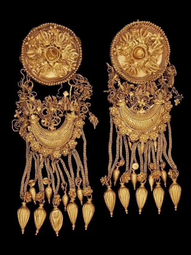 船型金耳环一对这对船型金耳环制作精美,装饰考究。在棕榈叶与玫瑰花结装饰的圆盘下,承载着一枚船型吊坠。船身以金粟炸珠工艺与一连串玫瑰花结装饰,两排种子形状的吊坠自船底垂挂。