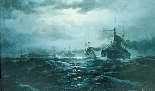 《夜间巡逻的爱琴海舰队》瓦西里奥斯·查齐斯在巴尔干战争(1912-1913年)期间受希腊政府委托,为皇家海军总部创作了大型战争海景画作为装饰,并因此名声大噪。为了尽可能真实地描绘希腊舰队的战斗场景,他曾登上战舰阿韦罗夫号。