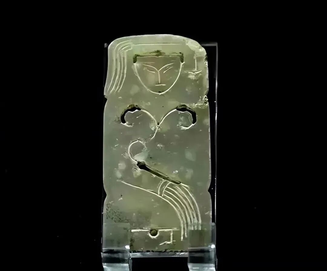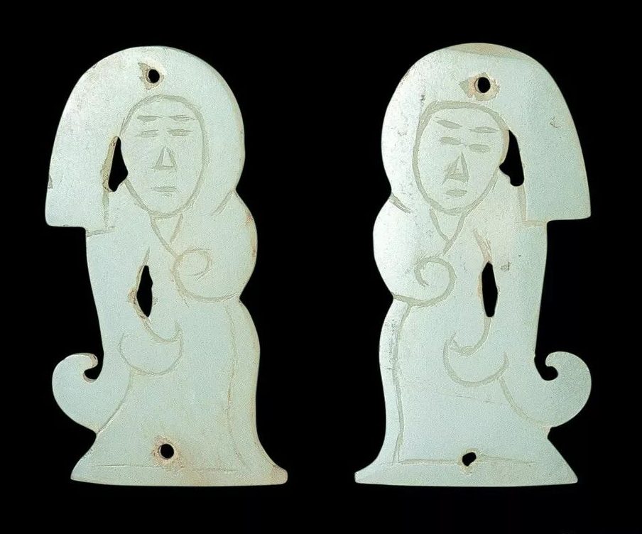 出土于南越王墓西耳室C258玉人,长2.65、宽1.2、厚0.2厘米,形象为两并肩站立的小人,虽然五官及肢体形态均难以分辨,背面尚可见线刻的发纹、衣纹、裙裾纹。