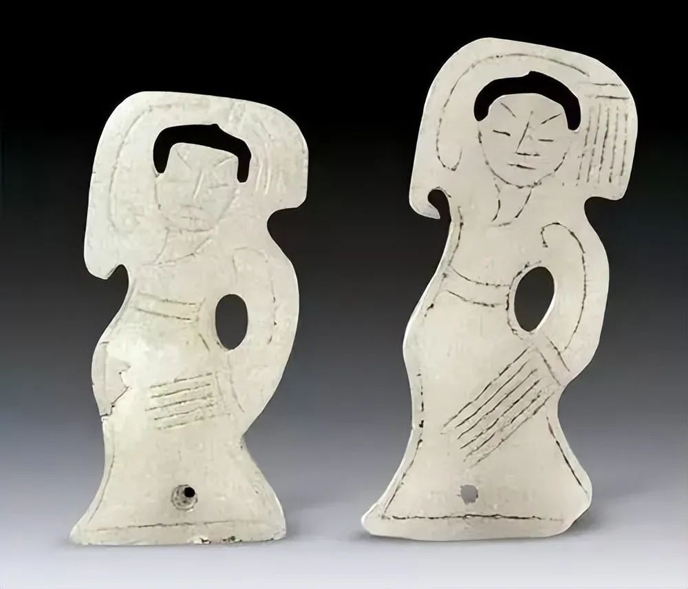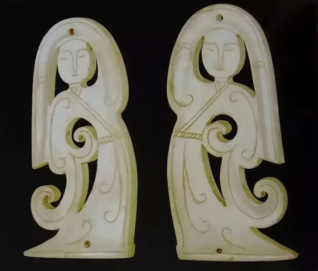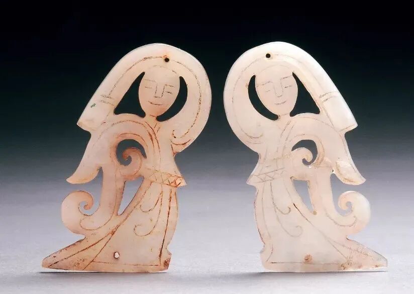 广州南越王墓为西汉中期大型汉代墓葬,出土了六件玉雕舞女佩饰,有单舞人佩也有双舞人佩,舞人或长袖绕舞,或并立而舞,或舞姿滑稽。为小人跳舞的形象,两面均以线刻勾勒出五官、肢体动作、衣裾。右手高扬甩在头顶,耸左肩,左臂卷曲向后。扭胯,提右腿抬膝。舞姿稍微与其它玉舞人不太一样,类似于猴舞。这几件玉舞人的做工包含了线雕、浅浮雕、高浮雕、圆雕、透雕,体现出当时汉代高超的制玉工艺,这些工艺出现在南越王墓的随葬品中,是汉越交融的见证。从玉舞人的精细程度看,每个玉舞人的质量各不相同,或许是为了体现使用者身份地位的差别。从4位夫人身上出土的玉舞人我们可以窥探出南越王4位陪葬夫人的身份高低,体现出当时的等级森严,这种上下尊卑的制度,是王朝君主专制下的产物,其目的是为了维护君主专制,说不定,在当时的南越国宫廷内,也上演了一出惊心动魄的宫斗故事。![]()