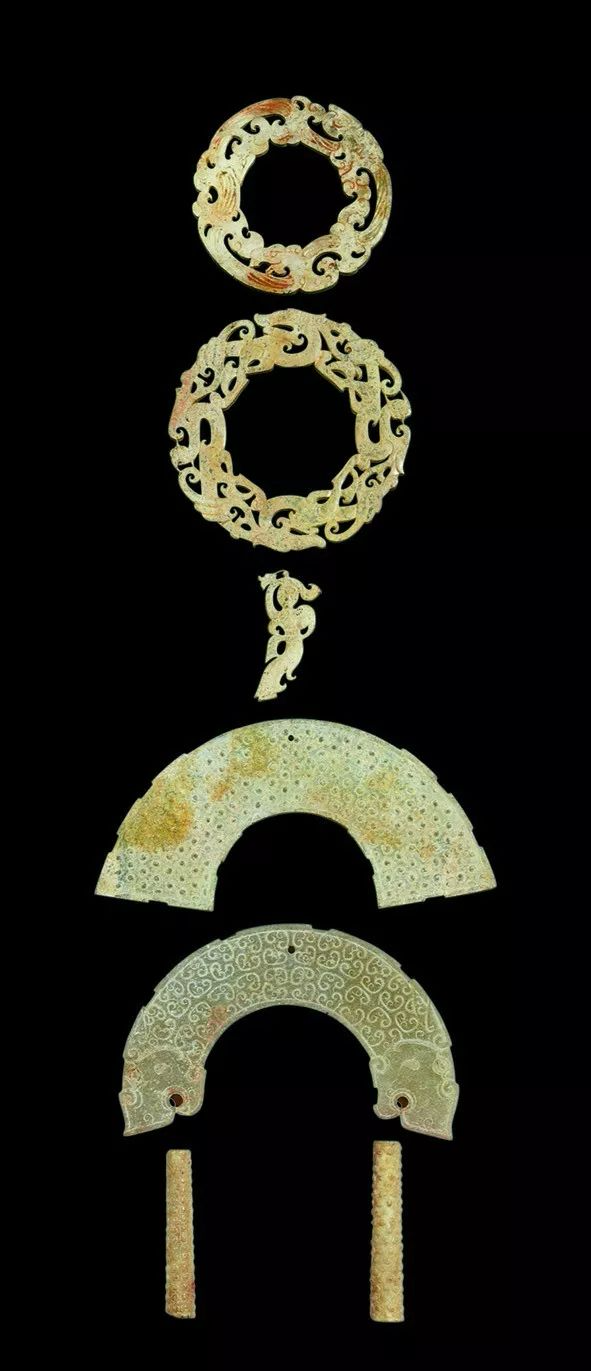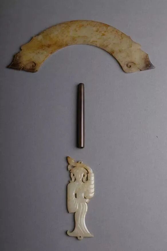 出土于满城汉墓二号墓窦绾玉衣内胸部,发现有玉舞人及蝉形、瓶形、花蕊形、联珠形玉件,以及水晶珠(5颗)、玛瑙珠(30颗)和乳白色石珠(9颗),推测这些饰件应为编联在一起的一组串饰。![]()