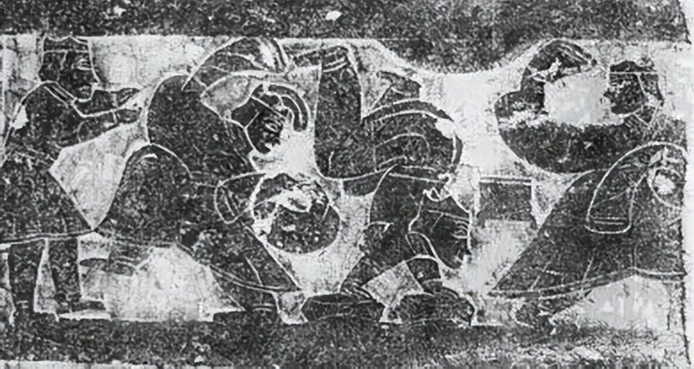 下层画像为舞乐、杂技表演场景,表演者共有五人,自左而右依次为:扣盘击节、飞剑跳丸(两剑、四丸)、跳盘鼓舞(二鼓、四盘)、鼓瑟、吹排箫。![]()