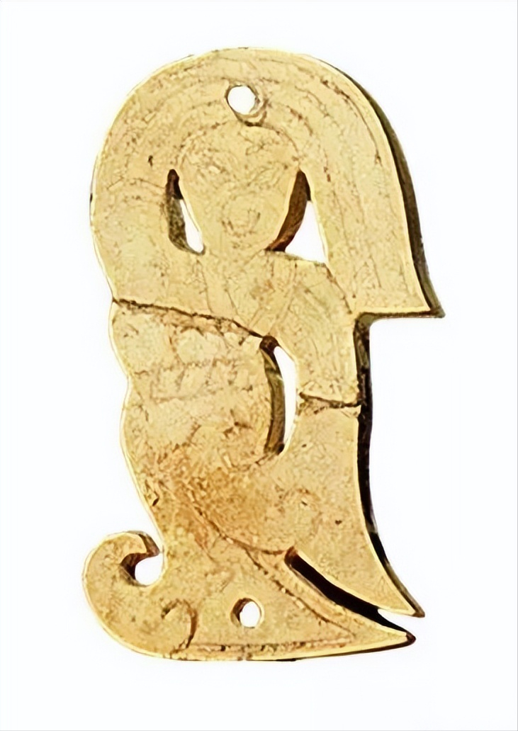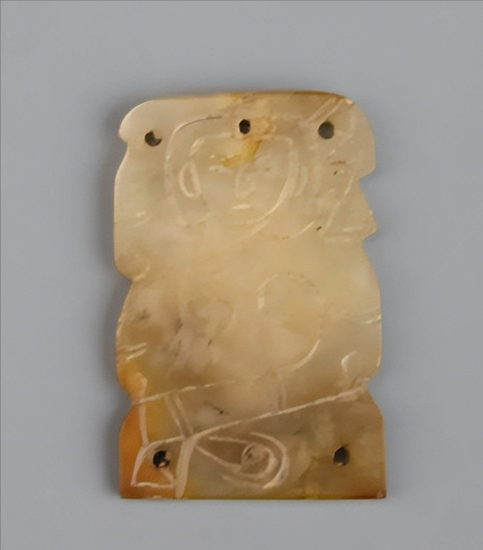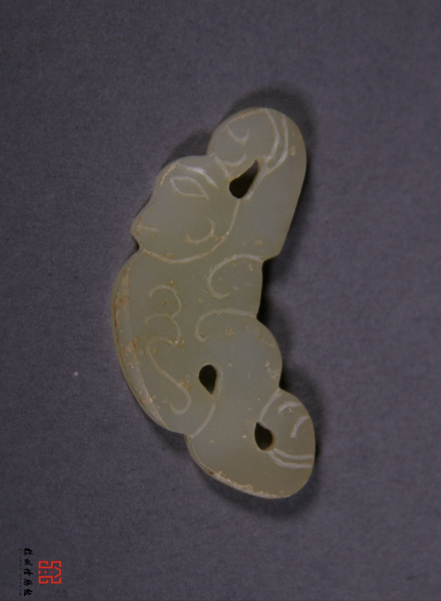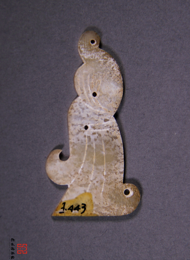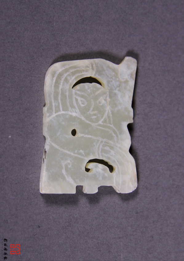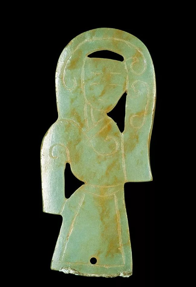 广州象岗南越王墓出土 ,做工稍显粗简,是部夫人组玉佩上的构件,线雕一人左手上扬至头顶,右手下垂于身下,并衣袖及地,作翘袖折腰的舞蹈状,正反两面内容相同,是部夫人组玉佩上的构件。![]()