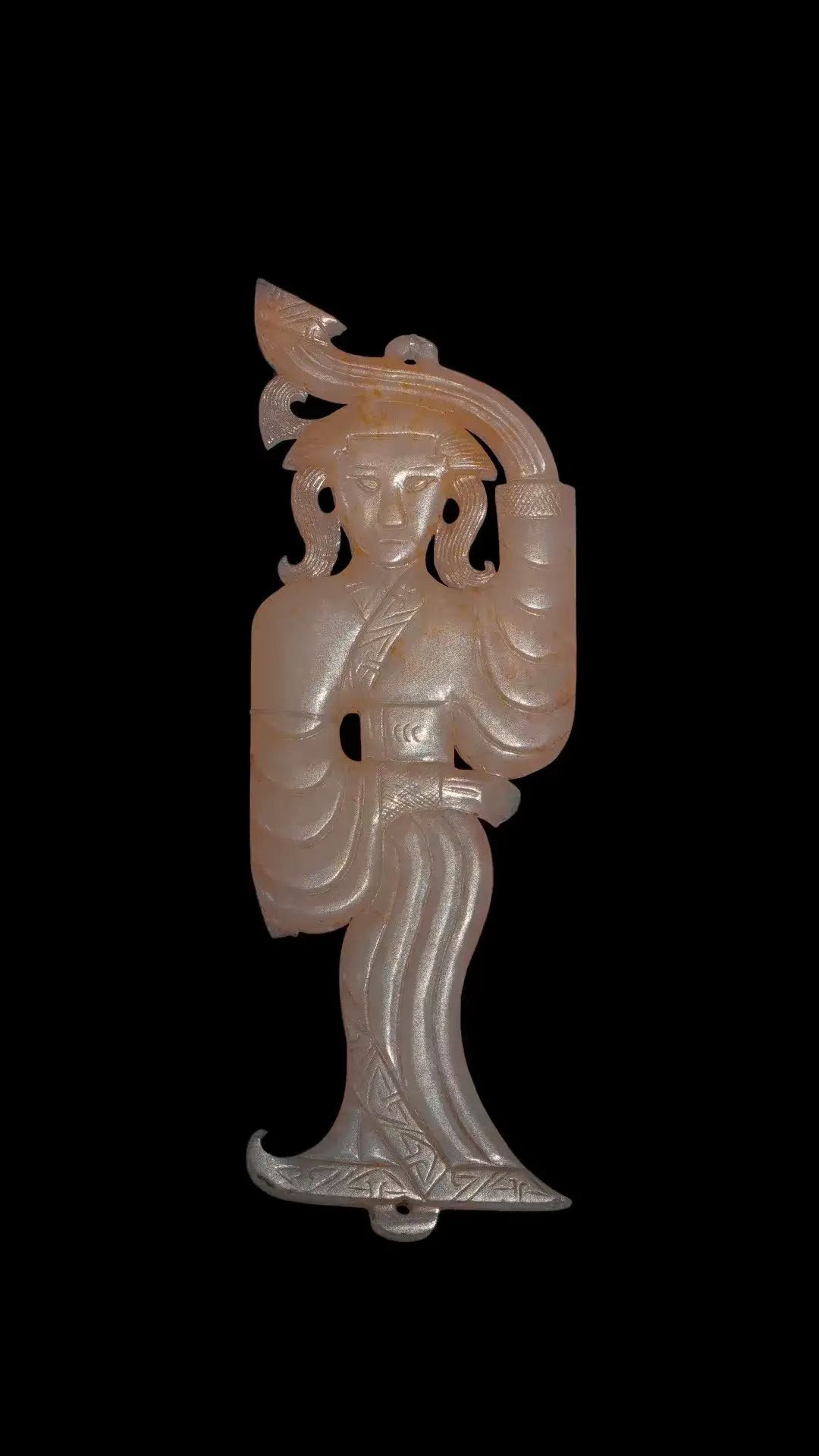 广州象岗南越王墓出土是右夫人组玉佩上的构件。其做工精细,运用线雕手法刻画出一人身着长袖连衣裙,右手举至头顶,左手放置于细腰前,长袖下垂,整体似舞蹈的形态。玉舞人头顶和脚底各有一小孔,且在腰部还挂系着一套线雕玉佩饰。![]()