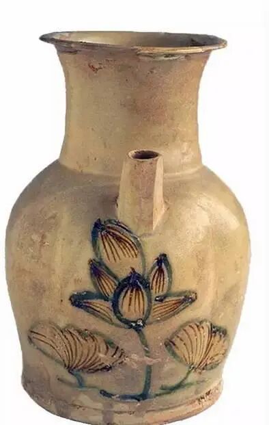 长沙窑在唐代创烧出的釉下多彩,打破了仅有釉下单彩的局面。虽然早在三国末年至西晋时期的越窑、湘阴窑就已生产有的青釉褐彩瓷器,且大部分是釉下点彩,但彩的份量比较轻,到北齐时虽有了白釉绿彩瓷器,但还是单色彩绘,且是涂抹装饰,并没有组成任何图案,长沙窑在唐代中晚期烧出了釉下褐、禄、红三色彩绘,并用彩绘组成各种图案或诗文来装饰器物。其中尤以褐绿彩最为普遍, 青釉褐禄彩莲花壶是比较有代表性的产品,通体施青釉,釉色青中泛黄,胎呈浅黄色,壶流下的腹部用褐绿彩绘以莲花纹,两片荷叶衬托着一支盛开中的莲花。纹饰以绿彩绘枝杆、勾勒莲花轮廓,用褐彩绘花叶经脉纹络。褐绿彩绘呈色纯正鲜艳,虽寥寥数笔,但神态如生。