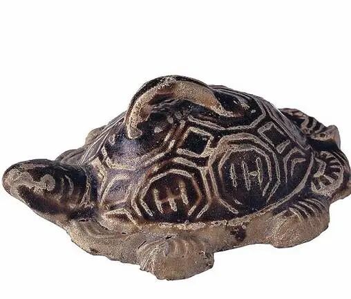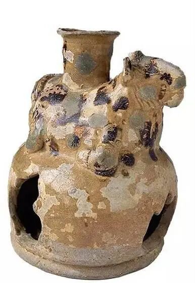 玩具大多是青釉褐彩、青釉褐绿彩或单色青釉。其中尤以青釉褐绿彩最美,如“青釉褐绿彩瓷羊”, 其身体成圆球形,头部较小,两耳肥大、垂至肩部,尾巴上翘贴附于臀部,四足短小,下腹部几乎贴地,腹部有三个可以吹奏的洞眼,灰白色胎,青釉褐绿彩装饰,该羊形体朔造夸张、但神韵非常逼真,加之褐绿彩呈色鲜艳,更加衬托出羊的温顺可爱。“青釉褐绿彩双狮镇纸”是镇纸中的上品,高6.2、底座长7.1、宽7.4厘米。双狮卧于一方形底座板上,头部朝向相反,双耳竖立,双眼炯炯有神,颈部系有一带铃铛的颈圈,全身有刻划的毛发,施青釉、并有釉下褐绿彩装饰,彩绘呈色纯正鲜艳,既具有很强观赏性、又是实用品,同时还可做玩具使用,因此这类产品能受到多阶层的欢迎。