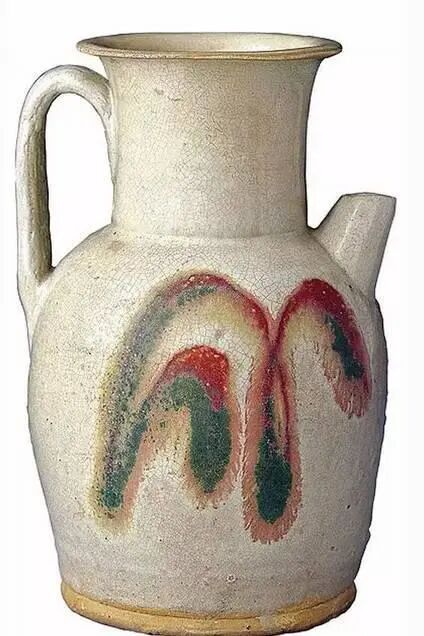 窑址中还出土不少红釉或红彩瓷器,这可是长沙窑给中国陶瓷发展做出的又一巨大贡献,关于长沙窑的红釉瓷器业界是这样评价的“从制品的总的水平看,唐代铜官窑(长沙窑)单色铜红釉的质量并不高,红釉的呈色也不够成熟,大部分色泽可能还没脱离原始阶段,但在中国制瓷史上首次运用铜作呈色剂在高温还原焰中烧制成功的红釉,较北宋晚期钧窑的窑变红釉早200多年,较元代景德镇生产的单色铜红釉早300多年。毫无疑问,钧窑的窑变红釉、景德镇的铜红釉正是在此基础上进一步发展而成的” 。这件白釉红绿彩瓷壶器形较高大,釉色乳白,红绿彩呈色鲜艳、纯正,写意画面抽象、飘逸,其图案既像飘动的彩带又像起伏的山峰,虽是寥寥几笔,却把人们带入无尽的遐想空间。红绿彩的着色剂为氧化铜,铜在氧化焰中呈绿色,在还原焰中呈红色。在一件瓷壶要同时烧制出红绿两色、且都要呈色纯正,其火候和窑温把握难道是很大的,因此它十分珍贵。