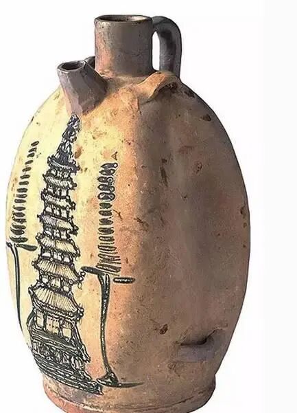 青釉绿彩塔纹瓷背壶 高24.8 口径3.4 底径11.3cm