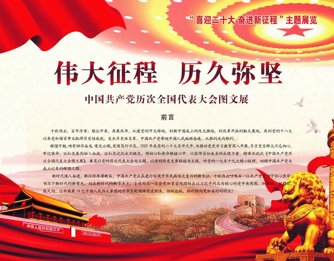 展览以“廉”为主线,分为“修身以养德”、“托物以言志”、“廉贤以示今”三部分。展览时间:2022年6月28日—2022年10月底伟大征程 历久弥坚——中国共产党历次全国代表大会图文展
