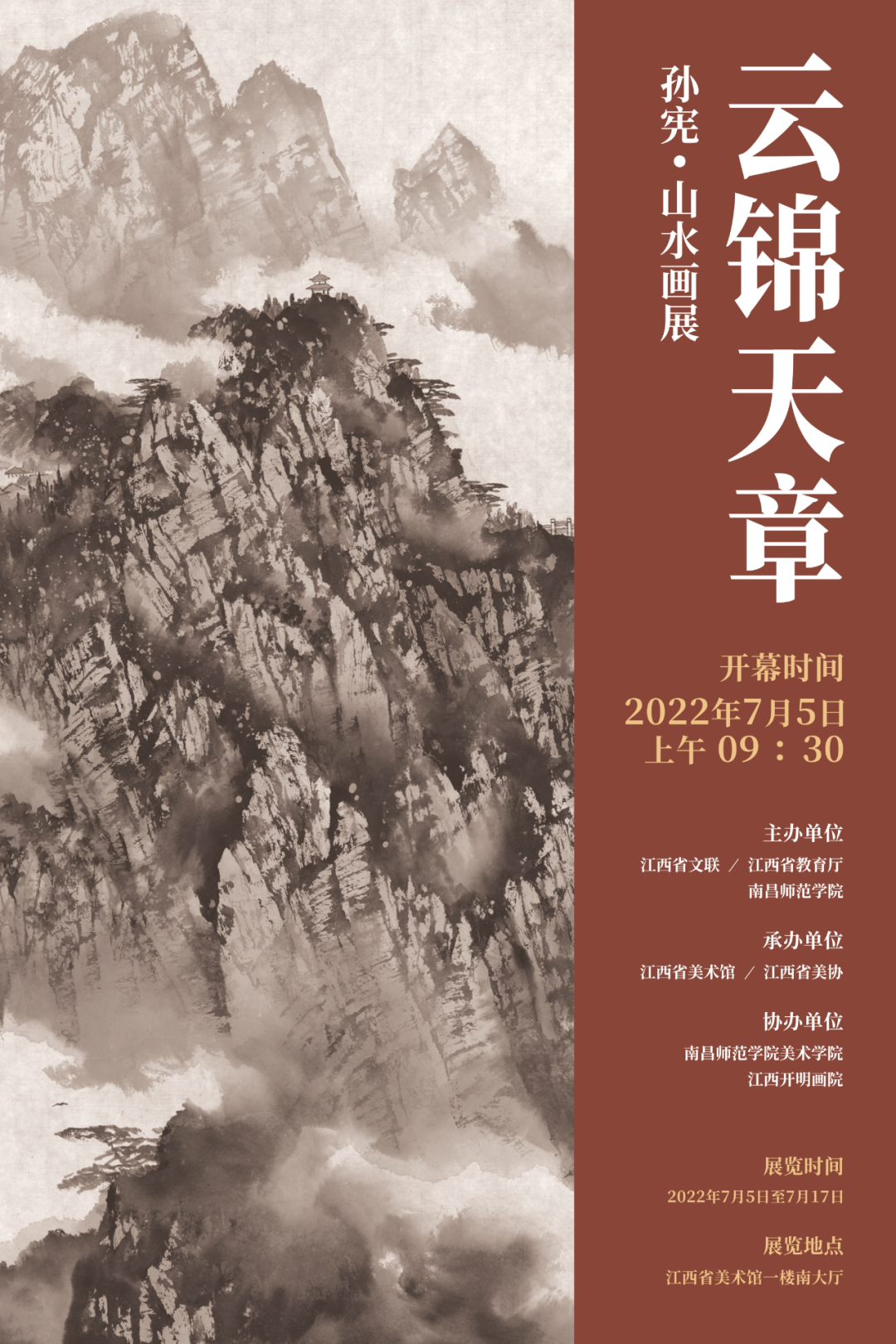 展览通过核心展品“伏鸟双尾青铜虎”及新干大洋洲商代大墓出土文物,揭秘“小鸟虎”的前世今生,感受新干大洋洲商代大墓的神秘与江南青铜王国的辉煌。融合艺术创作、现场操作、多媒体展示等多种交互形式,打造集历史、艺术、公益、文创于一体的多元展览,在丰富多彩的体验中,点燃好奇与求知的火花。展出时间:2022年6月1日—2022年8月31日展览荟萃明清两代11个经典画派,88位画坛名家78件(套)绘画精品,大家云集、群英荟萃,时间跨越明清两代,展现五百年来的笔墨风华。展览时间:2022年5月18日—2022年8月18日云锦天章—孙宪山水画展