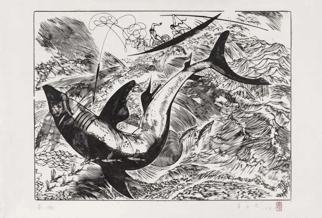 1961年黄永玉先生创作的《春潮》,表现的是惊心动魄捕杀鲨鱼的场景,整个画面极富冲击和动感。