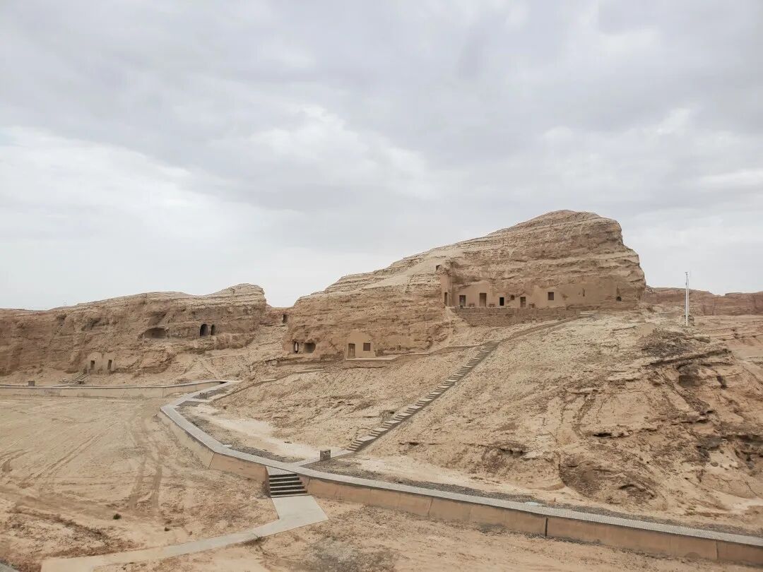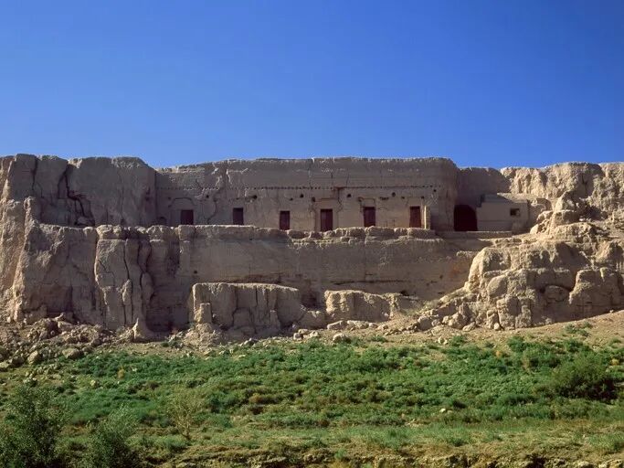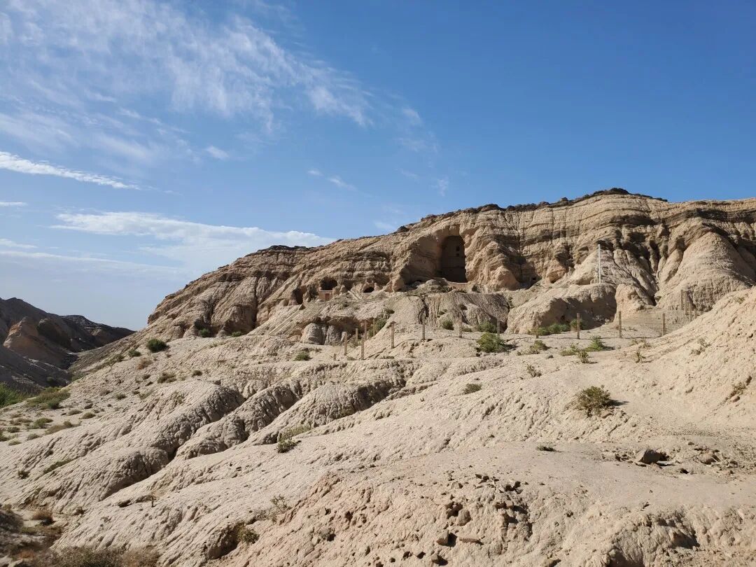 雅尔湖石窟,位于交河故城西郊,地处盐山雅尔乃孜沟黄土崖上,共有7窟,一字间隔分布,洞窟均呈长方形纵券顶窟形制,窟型高大,气度非凡,始凿于高昌郡时期,回鹘高昌时期有重绘,为佛教石窟群。