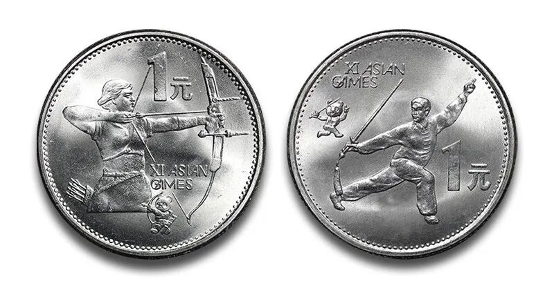 内含2枚第十一届亚运会纪念币,均为1990年中国人民银行所发行,一枚射箭、一枚武术,这套纪念币是我国第一套钢芯镀镍材质的,而且是唯一一套大直径钢芯镀镍纪念币,直径为30毫米,此后同材质的币直径均为25毫米。