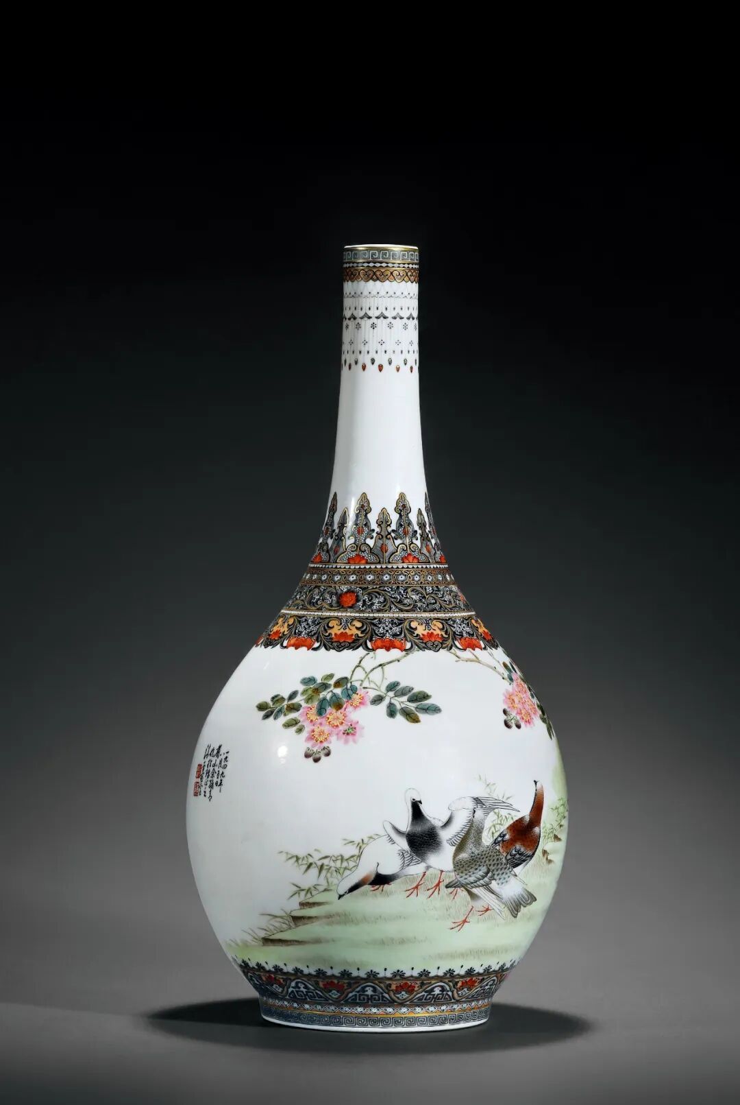 此件粉彩和平鸽胆瓶,瓶腹上部探出几株紫薇,绽放盛开,花朵艳丽,光彩夺目。花下四只象征和平的鸽子姿态各异,它们有的昂首挺立生机勃然,仰望春花期待无限;有的振翅抖羽翩翩若舞;有的伫立远望意气风发;有的喜悦觅食幸福安宁。画面整体意境欢快、喜悦、昂扬、鲜活,藉此象征了对和平的理解和愿景。