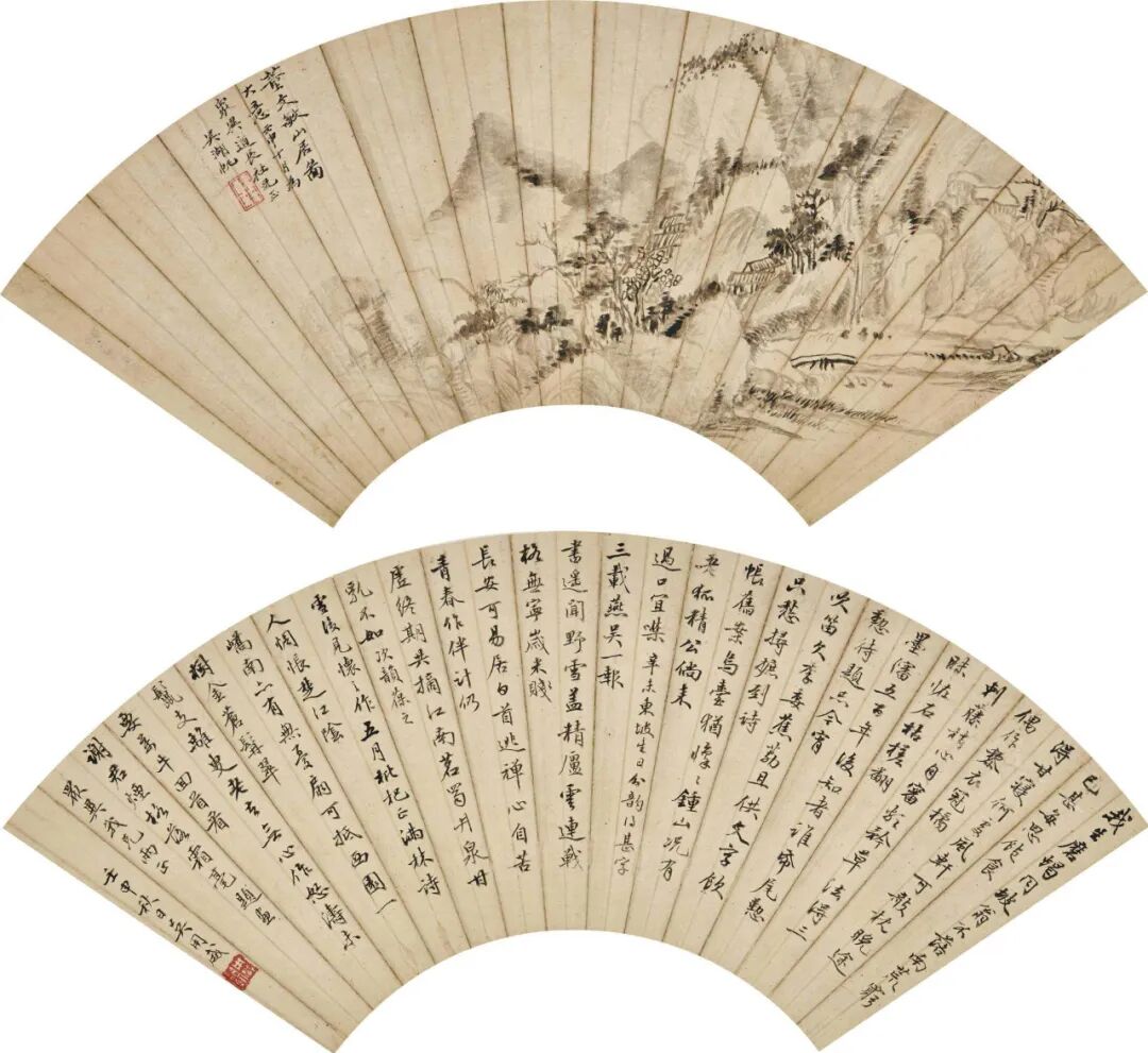 Lot 308吴湖帆、吴用威 拟董文敏《山居图》笔意·行楷书 扇面