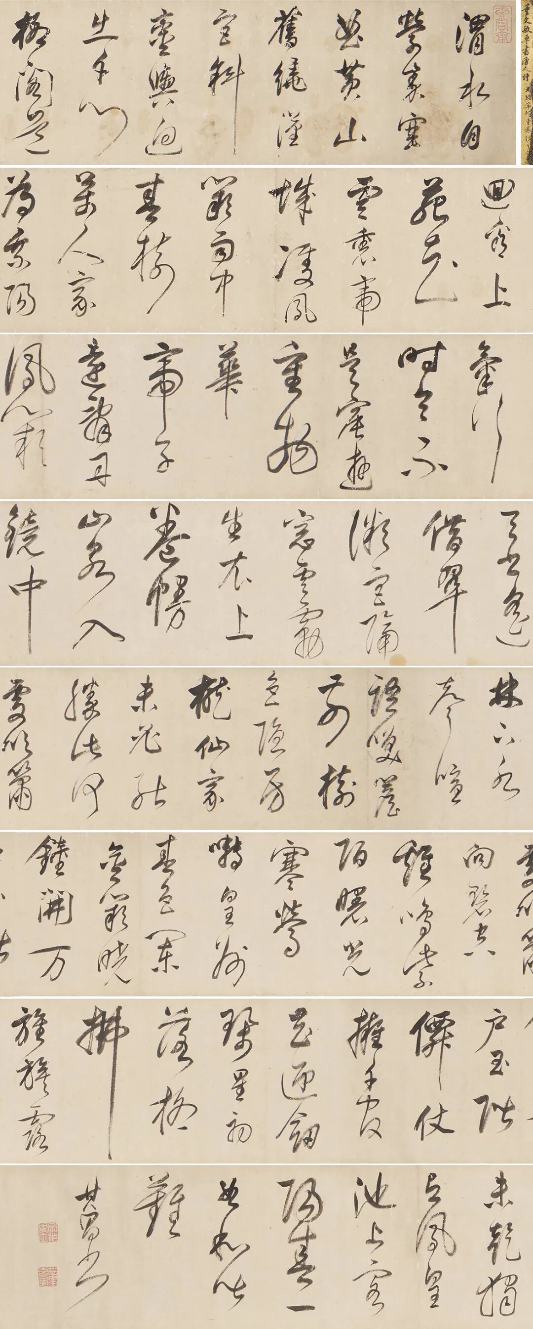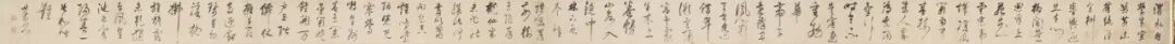 董其昌此卷写唐诗三首,内容分别是王维《奉和圣制从蓬莱向兴庆阁道中留春雨中春望之应制》、《敕借岐王九成宫避暑应教》及岑参的《奉和中书舍贾早朝明宫》,长7.6米有余,且是光绪辛卯原装老裱,百余年过去了,仍保存完好。书写由首至尾,一气呵成。墨彩生动,神气飞扬,无丝毫滞碍,令人神为之往。