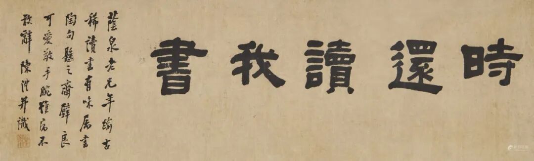 陈澧为清代广东大儒,学问渊博,作育英才无数。其行楷书出于大欧阳,而又能出入变化。复取米书之欹侧取势,故跌宕多姿,不同于欧书之刻厉。正文用隶书写出,得汉人正脉,又极少见也。此横幅落款云:“荫泉老兄年逾古稀,读书有味,属书陶句悬之斋壁,良可爱敬。手腕虽病,不敢辞。陈澧并识。”乃陈澧写赠其老友邓大林(字荫泉)的。