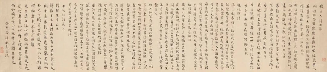 许承尧精鉴赏,富收藏,斋室有“晋魏隋唐四十卷写经楼”之名,可知其收藏敦煌写经卷之富,海内称第一家。其书法亦深受晋魏隋唐写经之影响,古拙朴茂,不假修饰,一任自然。得此一卷在手,书、诗两得,所获奢矣。在此卷落款中,知许承尧与上款人李释戡素未谋面,而写此诗卷,皆因其友剑平之介,感知音之难得,故恭楷录近作奉答。