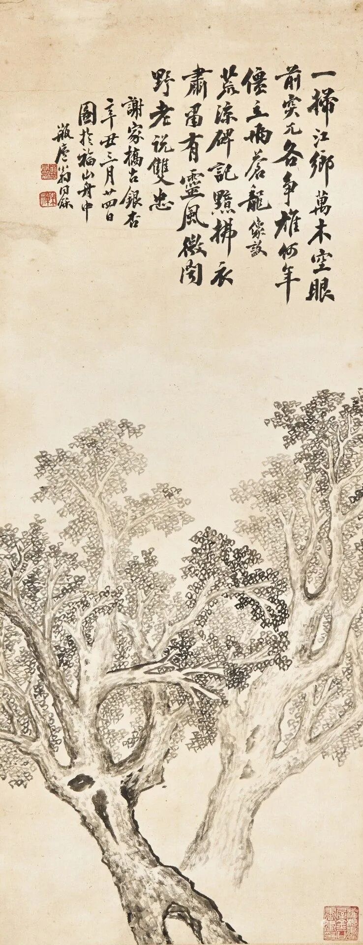 此帧翁同龢所绘《谢家桥古银杏》一图,写银杏古树两棵,一浓一淡,巨干密叶,其势似上可摩天。叶以双勾出之,圆叶与三角叶相间。树干上不点苔,用笔如雕如琢,重如铁铸,笔笔沉实。而墨不掩笔,笔不掩墨,笔笔清晰,悉见其笔墨功力之深厚。方之黄宾虹先生之画,实于此取法多多耳。此画画于辛丑,时年71岁,距其逝世仅三年,为其晚年之精作也。