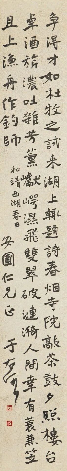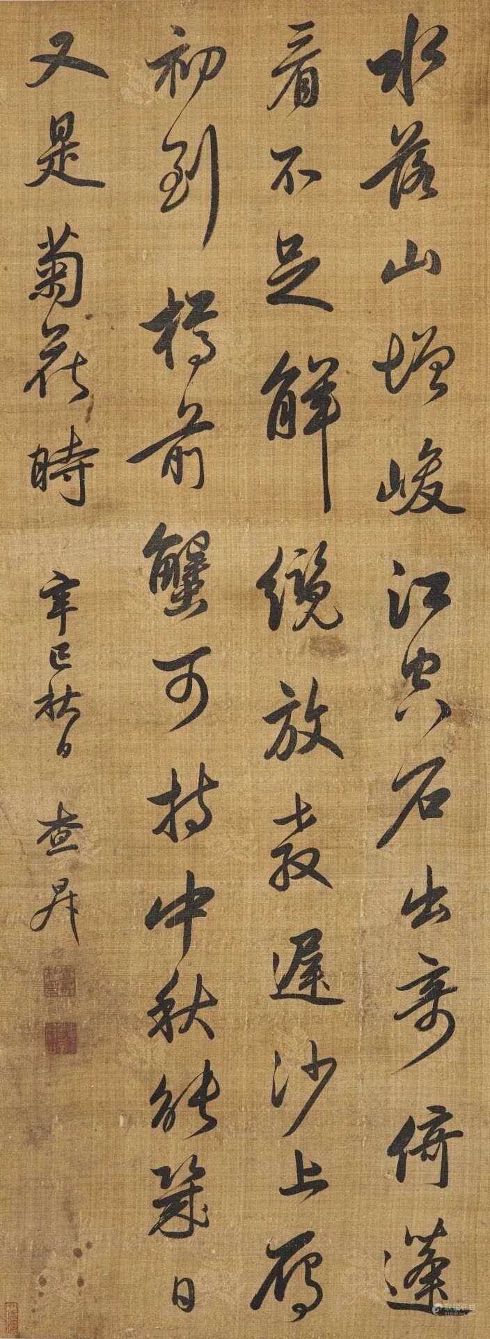 此绢本书宋戴复古《湖口》诗条幅书法,下笔利落,草、行相间,虽字字不连,而一气贯注,略无疑滞,豁然心胸。而查升书此幅时已51岁,为其晚年精作。