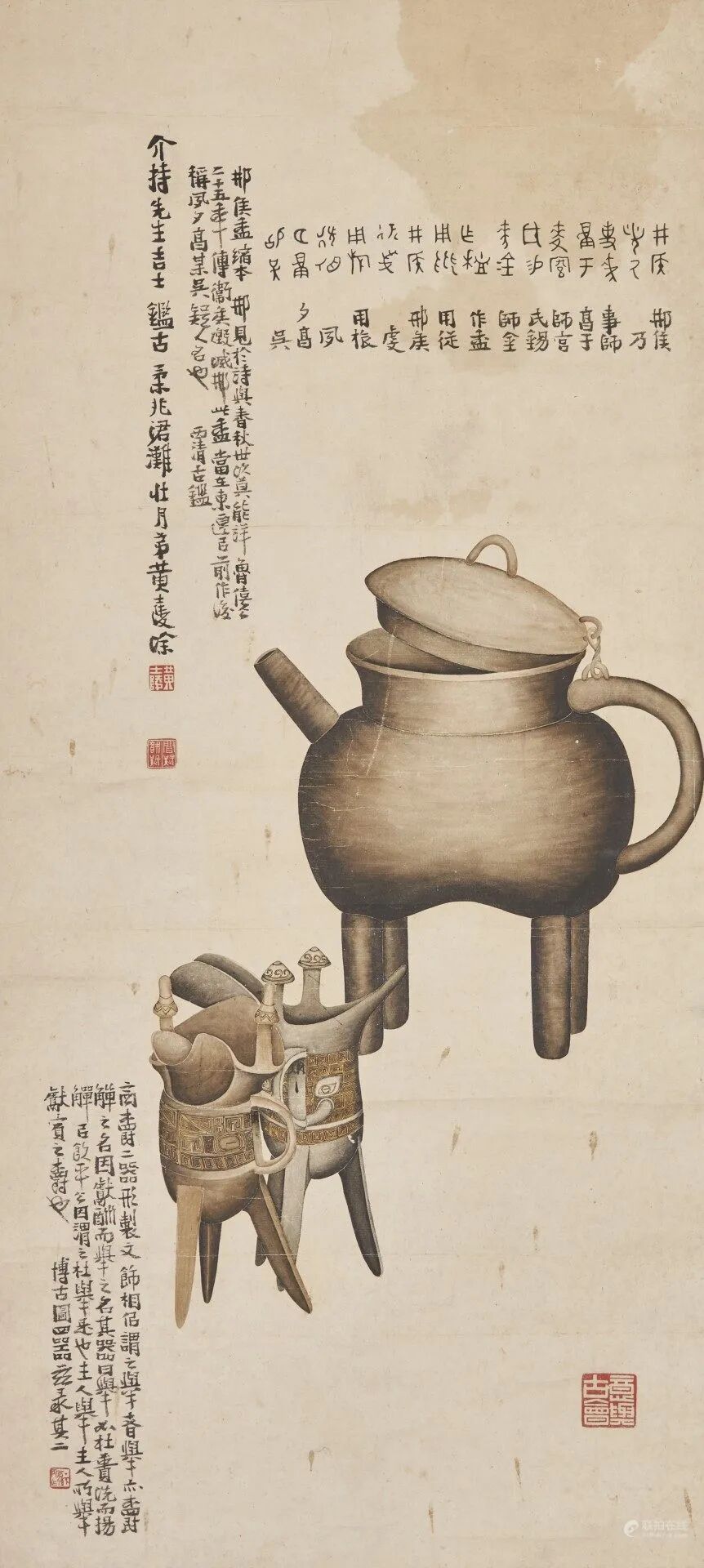 黄士陵所写《博古图》,中画邢侯盉及商爵二器,并录邢侯盉之铭文并释之。所画三器,依光源所照画出器物阴阳立体之效果,纹饰描写细致精确,极其生动,是穆父写青铜器之精品也。