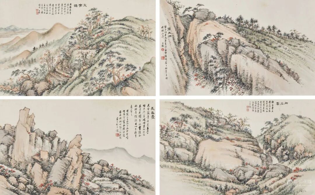 1910年5月,辛亥革命前夕,潘达微、樊增祥、江孔殷等知己好友相聚于南京,席间谈国故,感时伤事,挥笔以诗书画纪之,遂成此两扇佳作。第二年春,革命党人于广州举行起义失败,烈士曝尸集市,潘达微满怀悲愤,冒着生命危险,请慈善会为烈士收尸,慈善会不敢,江孔殷(别号霞公)以威望出面担保,烈士遗体得以归葬黄花岗。其人之义举,为千古所传颂。此二开团扇,正可印证三人的一段友谊和交往。另有三张杨念伯山水扇面和邓涛金笺山水扇面亦是两家之精彩之作。
