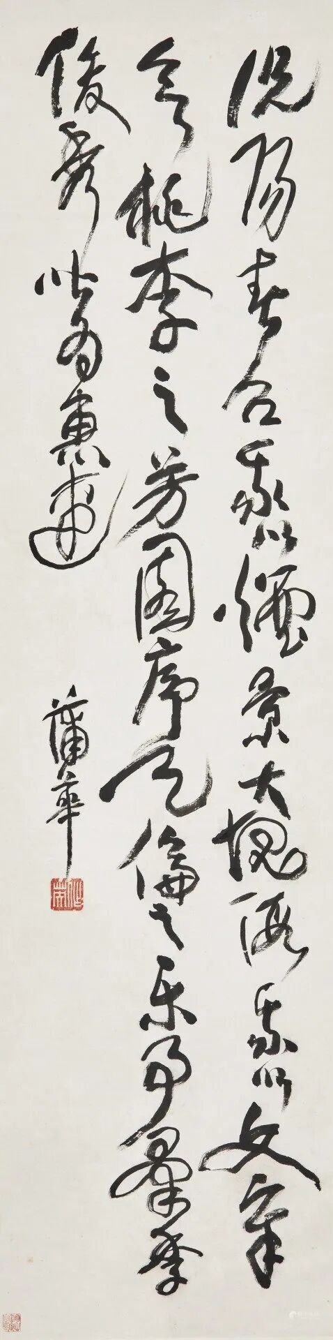 蒲华与虚谷、吴昌硕、任伯年合称“海派四杰”,其画为人所熟知,但其书法乱头粗服,逸笔草草,不为时所重。蒲华生当碑学大潮汹涌,无草书大家出现的时代,凭着其天才颖悟,不受碑学时风之影响,对旭、素草书作了创造性的继承和发挥,一种朴拙天真、意境高古、雅逸潇洒、淳厚多姿的“蒲式”草书脱颖而出,惊世骇俗。观此节录《春夜宴桃李园序》草书轴,信焉。