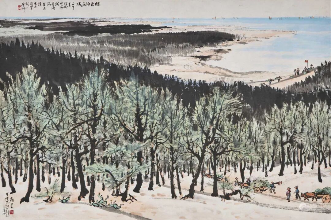 1973年,关山月迎来了艺术创作的第二高峰期,当中就包括这件里程碑式的作品《绿色的长城》。受当时大力提倡植树造林氛围影响,关老走遍了湛江、阳江等沿海地区,与当地群众共同生活,观察他们在海滩边造防护林带的做法,深有体会,由此创作这张名作《绿色的长城》。据关山月先生回忆:“我采用了石绿,这种颜色不透明,不好用。我吸收油画办法,层层加盖,才表现出深沉浓厚的感觉。在正面光线下,树很平板,我又第一层画阳光,第二层画黑的,表示云层挡住阳光,尽力把林带的层次表现出来。海水的画法也是吸收了西洋画的表现技法,使它和林带画法统一起来。但是,整幅我都力求保持中国画的特色。”,《绿色的长城》描绘的是广东电白博贺一带沿海如长城般守护着海岸而种植的木麻黄树,远处出巡的女民兵与近处推着牛车正在运送造林物资的女公社社员,更增添了画面的故事性,同时也丰富了绿色的长城这一主题,远方水天一色,意境开阔。