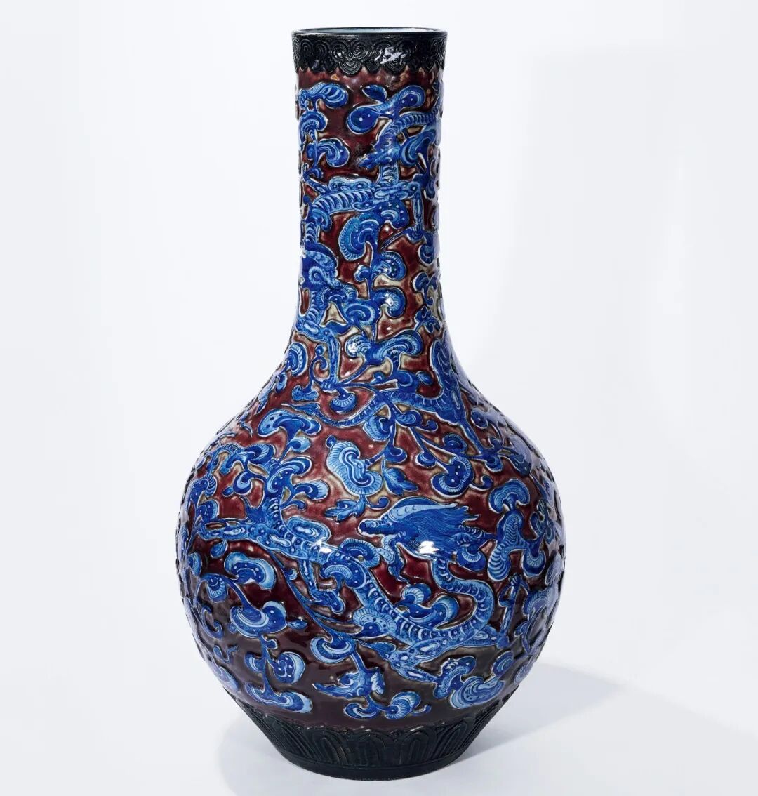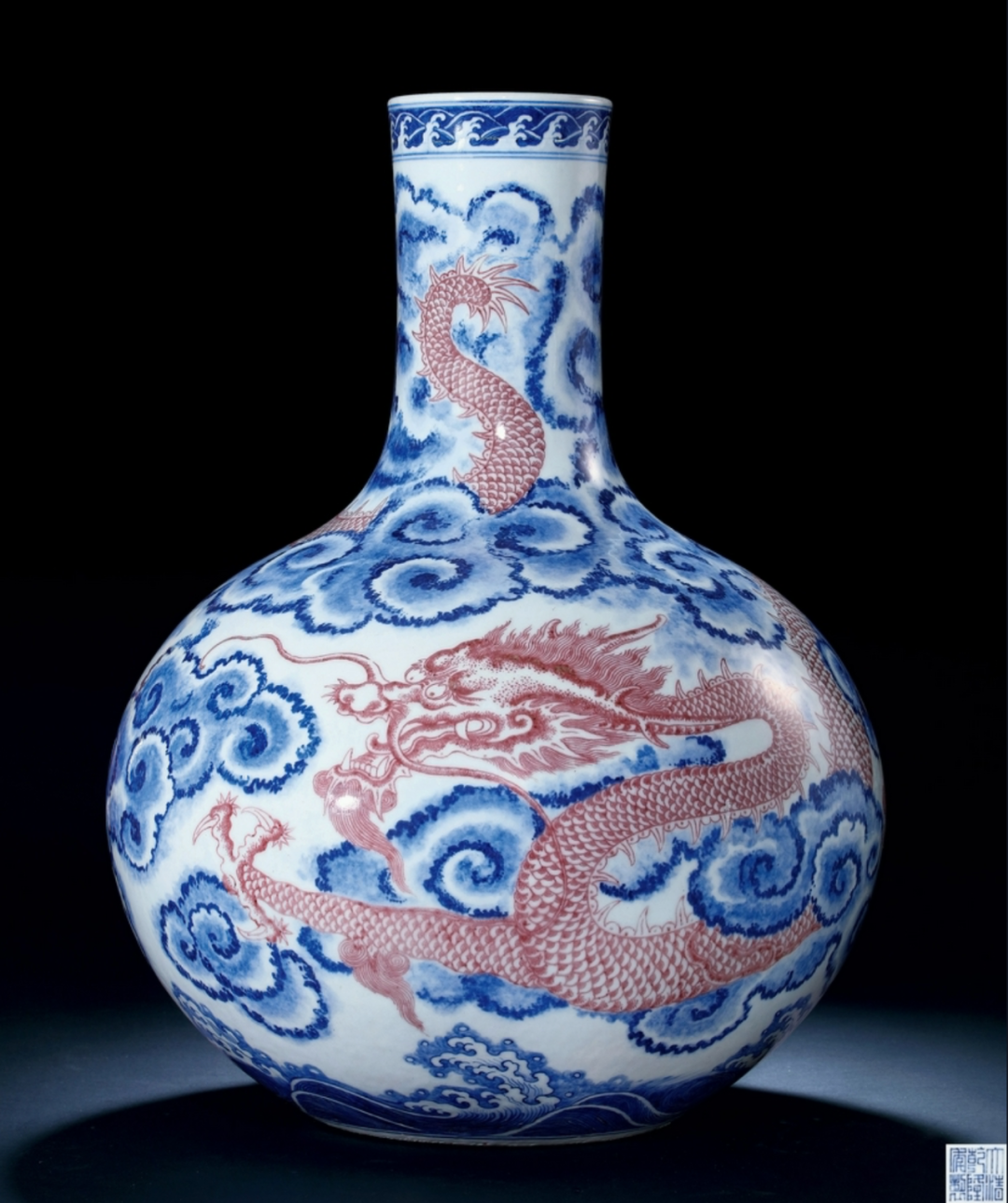 清雍正 御制青花釉里红云海腾龙大天球瓶