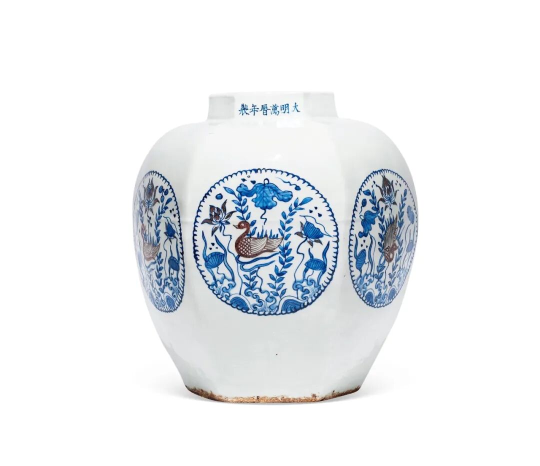 明万曆青花釉里红六开窗荷塘鸳鸯纹六棱罐