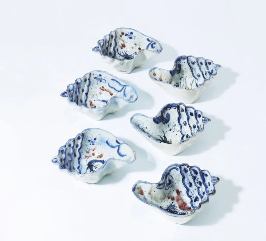 明天启 青花釉里红鱼藻纹海螺六件