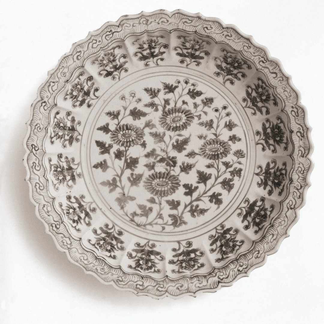 明洪武 釉里红开光式「寿鞠图」棱口折沿大盘