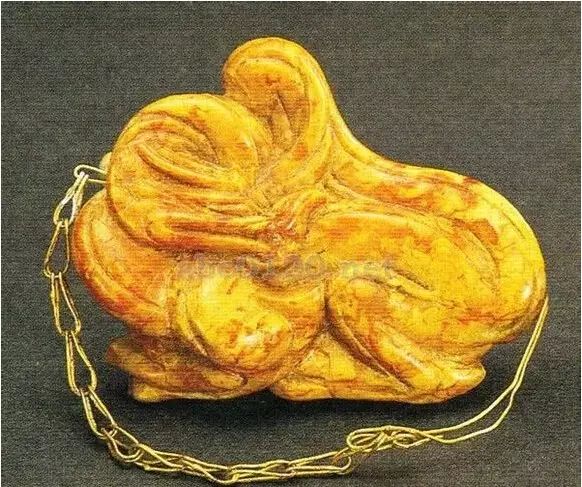 该饰物是以一条金链下系一块水滴状琥珀,琥珀为鲜红色,色泽艳丽通明,内部有一个气泡,聪明的匠师奇妙有利地势用了资料上的这一点小小的瑕疵,在琥珀的外壁依气泡的形状阴刻了两颗仙桃,衬以枝叶,显得清新自然,另一面则阴刻“瑶池春熟”四字,笔触洒脱潇洒。这件饰物既能够日常佩带,也能够闲暇时赏玩,和琥珀杯相同,都是墓主人生前的爱物。![]()