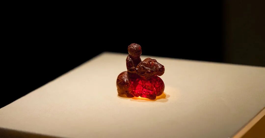 血珀骑羊俑,三国魏(220-265年),河南省洛阳市伊滨区西朱村出土,洛阳市文物考古研究院藏。