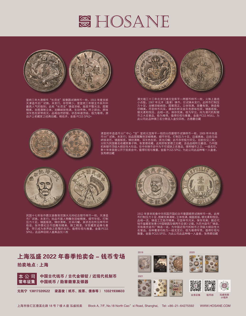 《中国收藏》:当上海突如其来的疫情来临,泓盛春拍钱币板块的筹备是不是也戛然而止?元凯宁:在上海疫情突发时,泓盛春拍钱币拍品征集工作已经基本结束,拍品整理、图录印刷等工作正在推进中。在被迫延期的这段时间里,我们并没有停歇,而是重点对外宣传了两个藏家专题——“习静居珍藏中国机制银币专题”与“启尔德、启真道家族旧藏中国机制币”,引起了不少藏家的关注。“习静居珍藏中国机制银币专题”将呈现习静居主人近30年来珍藏的上百枚中国机制银元精品,基本涵盖了藏家在这一领域的全部心血。从清代龙银到民国军阀,从主币到银毫,均为收藏品质很高、钱币状态一流的钱币精品,其中更不乏各品种中的评级最高分数。比如民国三年袁世凯像“甘肃”加字壹圆银币为甘肃造币厂所铸,是各种版本“袁大头”中唯一加注地名的品种,经评金盾PCGS MS62,为此公司此品种唯一的第一名分数,且MS以上评分仅此一枚。经评金盾PCGS MS62,为此公司此品种唯一的第一名分数,且MS以上评分仅此一枚。“启尔德、启真道家族旧藏中国机制币”专题则将呈现启尔德与其子启真道的部分珍藏。启尔德是著名的华西协和大学的开创者之一,曾与启真道于1891年至1952年在四川工作。父子二人收藏兴趣广泛,此专题就将上拍他们在四川时期收藏的诸多比较有特色的藏品。这批藏品来源于启尔德后代,目前均已经PCGS评级。《中国收藏》:除了这两个藏家专题,本次春拍中还会有哪些“硬货”?元凯宁:一枚清宣统年造造币分厂中心“吉”宣统元宝库平一钱四分四厘银币试铸样币,原属耿爱德旧藏,《中国币图说汇考》中亦见相关著录,后经著名钱币学家张璜、台湾著名藏家张秀卿、资深钱币藏家陈吉茂递藏,可谓流传有绪。此币经评金盾PCGS SP62,为此公司此品种唯一入盒者,本次为数十年来首次在拍卖会中公开亮相。目前,与此币同类样币仅存两枚,另一枚由一名已故藏家的后人珍藏。清宣统年造造币分厂中心“吉”宣统元宝库平一钱四分四厘银币试铸样币金盾PCGS SP62,为此公司此品种唯一入盒者。1909年中央造币分厂试铸,未发行。此币图案雕刻深峻精美,细节毕现,打制压力十足,边齿马齿峤拔凌厉,镜面版底,铸纹清晰,深灰色包浆,底光闪耀。此币存世极为罕见,目前仅见二枚,分别为民国著名收藏家秦子帏、耿爱德旧藏,此枚即为耿爱德旧藏。另有一枚1912年袁世凯像中华民国开国纪念币壹圆银质试铸样币,压力十足,图案清晰,为台湾已故著名钱币收藏家张秀卿先生珍藏。值得一提的是,该币经评金盾PCGS SP55,且为此公司此品种唯一入盒者,极为难得。1912年袁世凯像中华民国开国纪念币壹圆银质试铸样币金盾PCGS SP55,为此公司此品种唯一入盒者。据近代钱币鉴藏家张璜《中国银圆及银两币目录》记载,此币为苏州造币厂铸造,样币打制压力十足,图案完美清晰,立体饱满,镜面底板,银光柔和悦目,品相一流,铸造工艺精美。还有一枚民国十七年张作霖文装像背双旗大元帅纪念银币样币,为天津造币厂试铸,其状态在所见样币中极佳。此币经评金盾PCGS SP61,此品种目前入盒珍品仅8枚。金盾PCGS SP61,天津造币厂试铸,未发行。拍品币面人物雕刻深峻精美,细节毕现,打制压力十足,镜面版底,铸纹清晰,光泽闪耀,其状态在所见样币中极佳。《中国收藏》:如此优质的拍品能够在泓盛亮相,相信其间也经过了不少努力与尝试。元凯宁:这主要得益于我们拥有相对雄厚的藏家基础。可以说,此次春拍中大部分拍品的征集过程都比较顺利,有部分拍品在评级过程中费了一些周折。比如1912年袁世凯像中华民国开国纪念币壹圆银质试铸样币,尽管其曾于1985年在拍卖市场付拍,但却是首次送评。评级公司缺乏关于这枚币的相关记载,也缺少资料佐证,这就需要我们为评级公司提供更为丰富的补充资料。《中国收藏》:其实,现在对拍卖公司而言,找货源是一大难题。泓盛在这方面是不是也有压力?元凯宁:根据往年数据统计,泓盛钱币每季大拍从境外征集的拍品数量基本占到了全部拍品的四分之一左右。但疫情发生后,我们已有近3年没有到境外进行拍品征集。不仅如此,境外拍品入境也成为了一个难题。比如启尔德、启真道家族旧藏中国机制币需要从加拿大运往上海,但因为两地不通邮,所以藏家需要先将藏品运到澳门再申报入境,仅这个运输流程就耗费了半年多时间。但令人欣喜的是,泓盛在多年耕耘下取得诸多亮眼佳绩,这也助力泓盛在国内拍品征集方面有所突破。1911年度支部天津造币总厂试铸,未发行,存世稀少,是宣统三年银主币系列中最具人气的版别,经评金盾PCGS SP62+,源自沪上老藏家之经典旧藏。此枚“长须龙”铸造深峻,版底平整光洁,图案精美,龙图清晰立体,龙鳞峭拔饱满,生动传神,原味深灰色包浆带底光,品相自然舒服,状态味道顶级。金盾PCGS MS61,为此公司此品种第三名分数且入盒仅4枚。此枚币属于火珠上直线小点版,1907年北洋(直隶)铸币,仅试铸未发行。其打制压力十足,龙鳞深峻峭拔,立体饱满,铸造精美,通体折射淡金灰色,原味包浆,镜面底版,银光柔和悦目,品相一流,保存完美,向为清代机制银币之大名誉品,极为难得。《中国收藏》:为了保证此次春拍的顺利进行,泓盛有何应对之策?元凯宁:本次泓盛春拍钱币预展与拍卖时间将持续9天,这将是迄今为止时间最长的一次。为了确保春拍顺利进