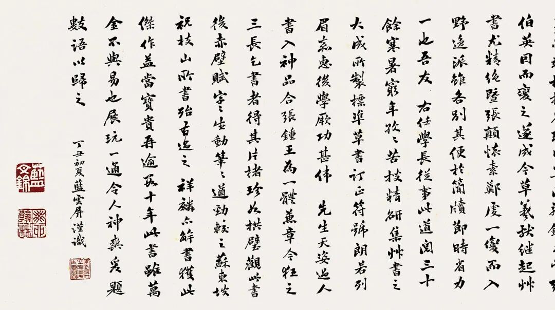2.虫游作急就章开草书之先河阙后皇象、索靖、杜操、崔瑗皆善此礼钟元常、张伯英因而变之遂成今草,羲献继起草书尤精绝暨张颠、怀素、郑虔一变而入野逸派虽个别其便于简牍节时省力一也。吾友右任学长从事此道阅三十余寒暑穷年孜孜苦搜精研集草书之大成所制标准草书订正符号朗若列眉嘉惠后学阙功甚伟。先生天资过人,书入神品合张钟王为一体兼张今狂之三长乞书者得其片楮珍如拱壁,观此书后赤壁赋字字生动、笔笔遒劲,较之苏东坡、祝枝山所书殆有过之,祥麟亦解书获此杰作益当宝贵再逾数十年此书虽万金不与易也,展玩一通令人神爽,爰题数语以归之。丁丑初夏蓝云屏谨识。钤印:云屏六十以后所书、蓝文锦、癸卯翰林
