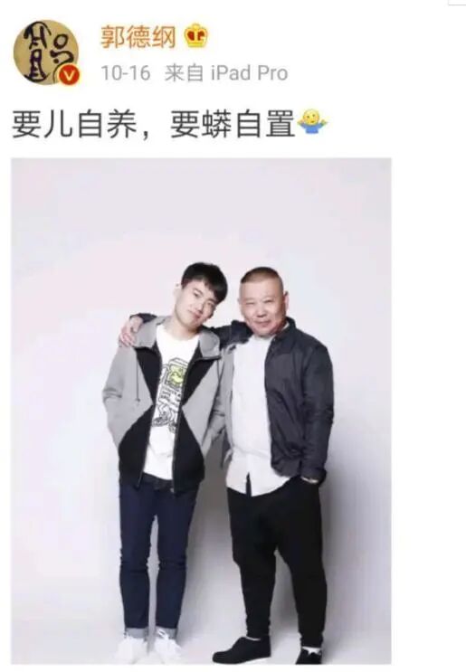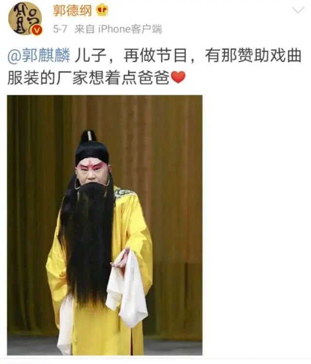 众所周知,德云社班主郭德纲在近几年有了一项爱好,就是收集“蟒袍”,不仅自己喜欢,还从各方面暗示手下弟子送蟒,岳云鹏、烧饼等人已经不知道送了多少件了,唯有老郭最钟爱的儿子郭麒麟,这么多年来从未买过一套蟒给父亲,这就导致郭老师时不时的就要在微博上问儿子一声![]()