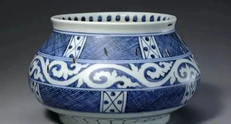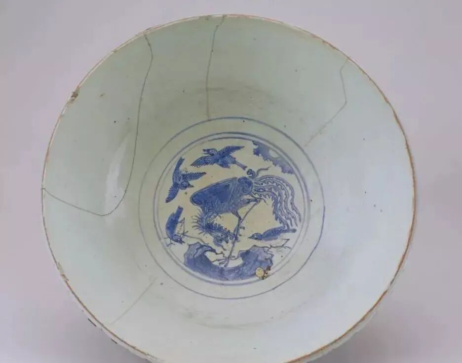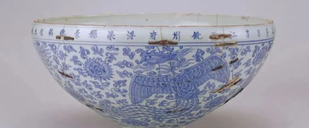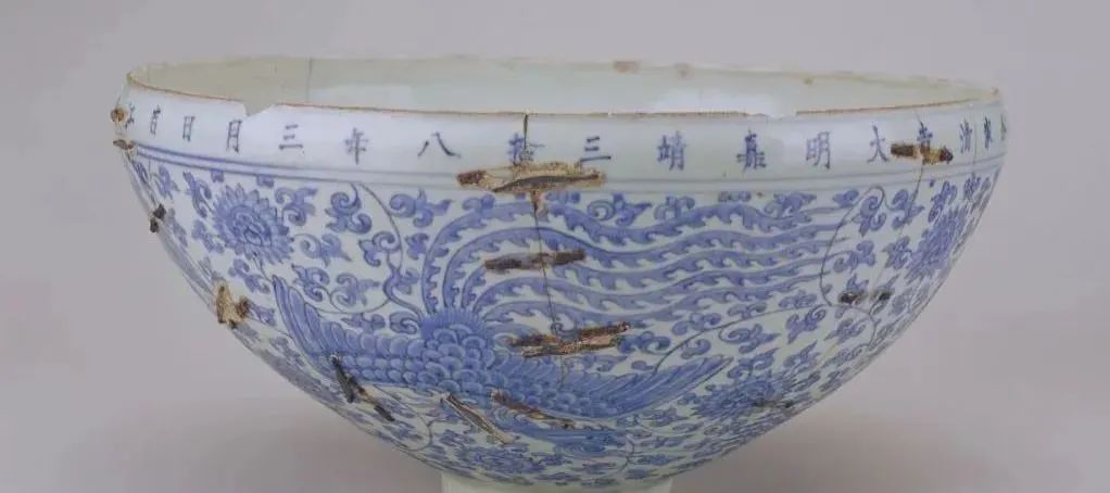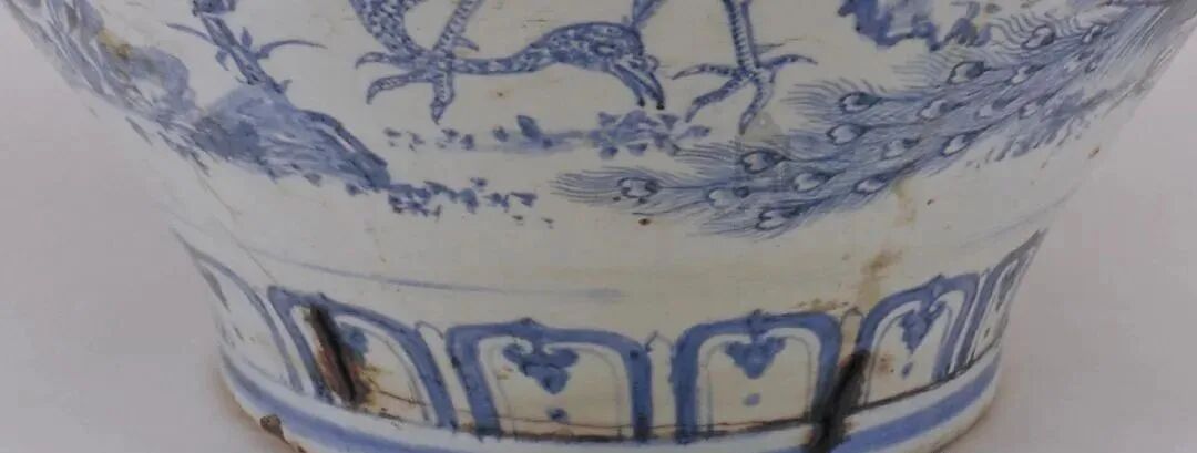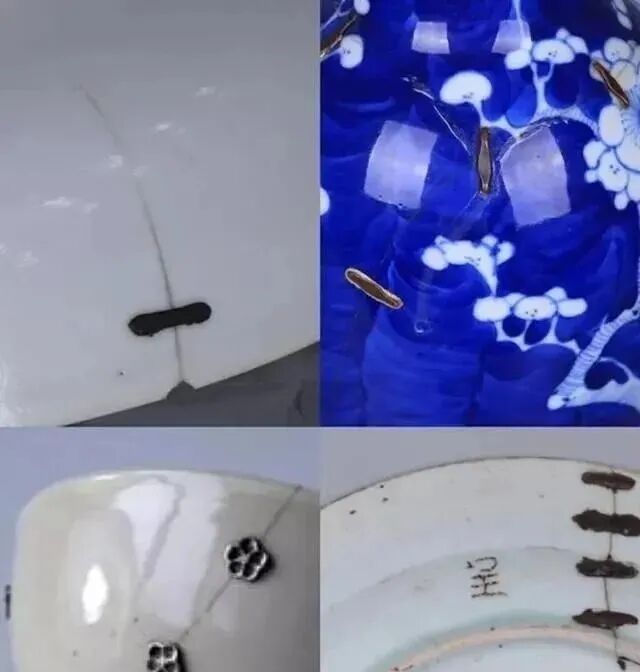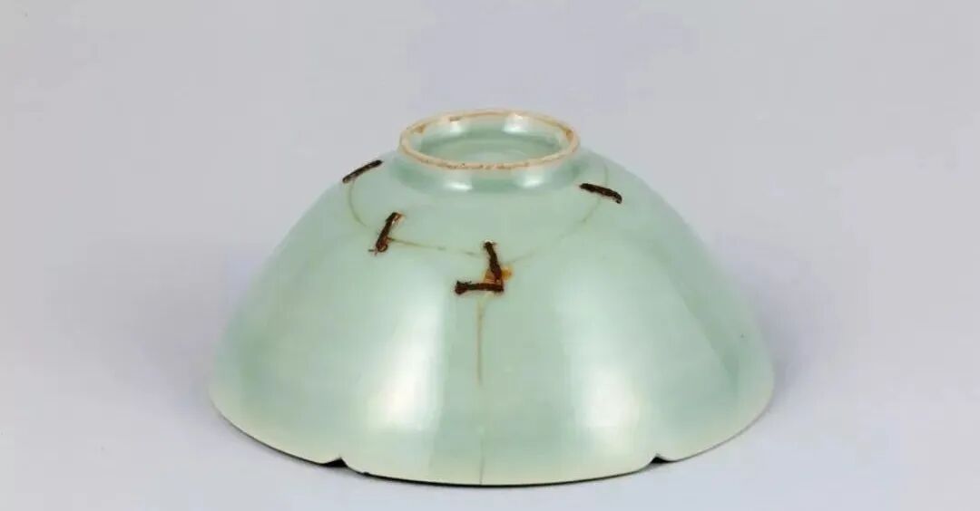马蝗绊的特殊之处在于其经过锔补,虽然从表面上看并不十分完美,却生动诠释了不完美之美。釉色纯净,柔和淡雅,如冰似玉,烧制工艺可以说达到龙泉窑历代之最。底部的裂纹与锔钉,更是为它增添了独一无二的残缺之美。这说的是一门古老的民间手艺——“锔瓷”,就是把打碎的瓷器,用像订书钉一样的金属“锔子”,再修复起来的技术。然而这种技艺并不只存在于民间,故宫博物院清宫旧藏中有经过修补的明清瓷器,其中不乏官窑瓷器,已经表明了明清宫廷应存在有锔瓷的修补行为。2014年9月,故宫博物院考古研究所在故宫西华门内的南大库遗址进行考古发掘,清理出一处灰坑,出土大量明清时期官窑瓷片,其中,发现了多件带有钻孔及锔钉痕迹的官窑瓷器残件。故宫南大库遗址的位置与年代表明了这些官窑瓷器在明清时期于宫廷中进行了锔补,以这类考古出土发现为依据,从考古学的角度证明了明清时期宫廷中利用锔瓷工艺修补瓷器行为的存在。结合前述清宫旧藏中经过锔补的明清官窑瓷器,加之清代档案中亦有对修补瓷器的记载,从多个角度证明了明清时期宫廷中会运用锔瓷技术修补瓷器。