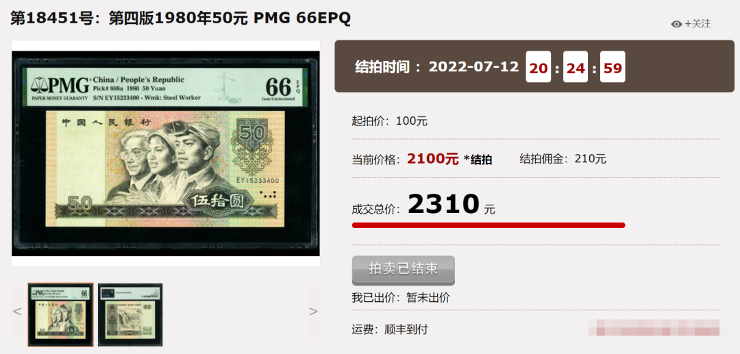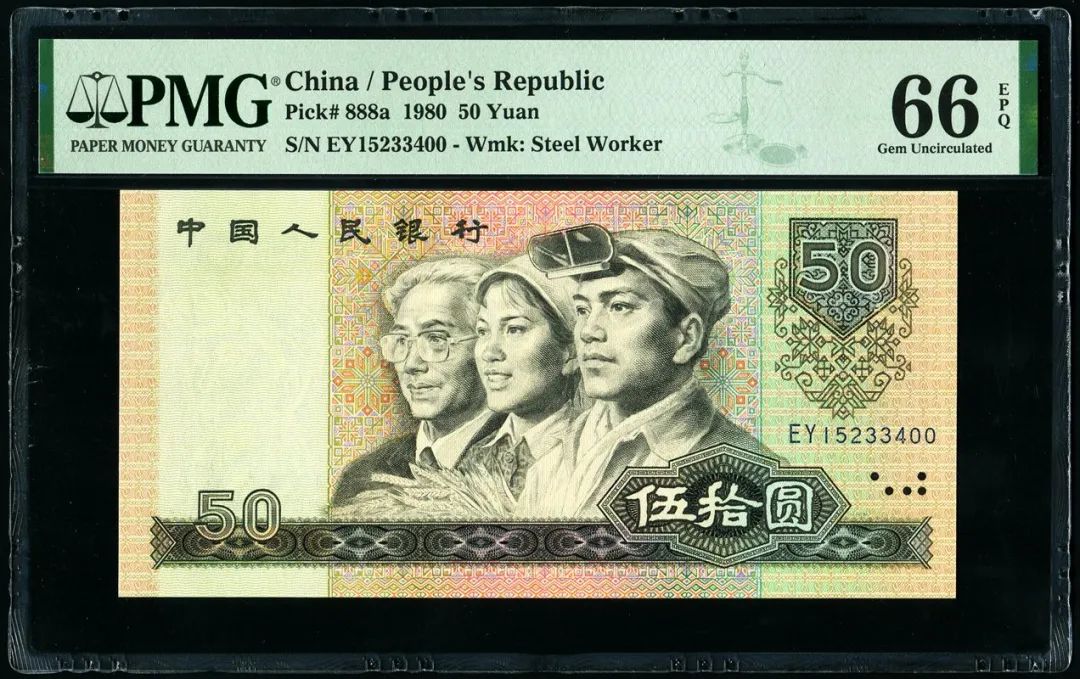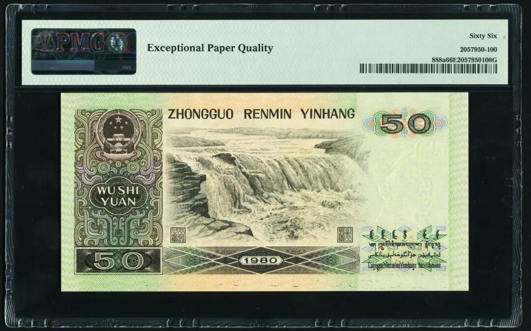 在近期的一场拍卖中,一张PMG 66分的80版50元,就拍出了2310元的高价!