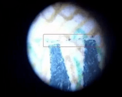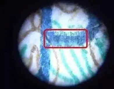 正常情况下肉眼是看不出的,就算是拿几十倍的放大镜也勉强且模糊的看出,拨开粘层之后如下图示:
