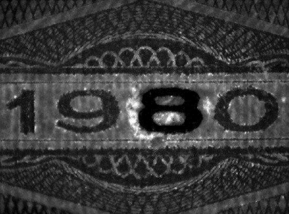 冠字增减笔画:增加笔画是直接在冠号上添加笔画;减笔画的时候因为要刮除所以会损坏底纹。