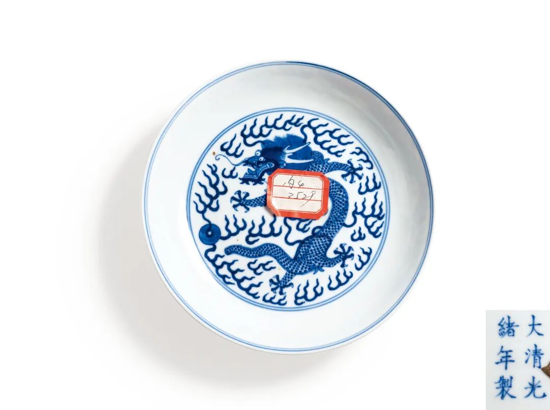 说明:盘敞口、浅弧壁、圈足。整器施白釉,以釉下青花装饰,盘心双圈内绘五爪立龙纹,刚劲有力,盛气凌人。周身环饰火焰状云纹,外壁则以青花绘双龙赶珠,二龙前后相逐,躯体舒展,动感十足。此类纹样自康熙朝开始烧造,一直延续至清末,为清代官窑传统制式。底书“大清光绪年製”双行六字楷书款。