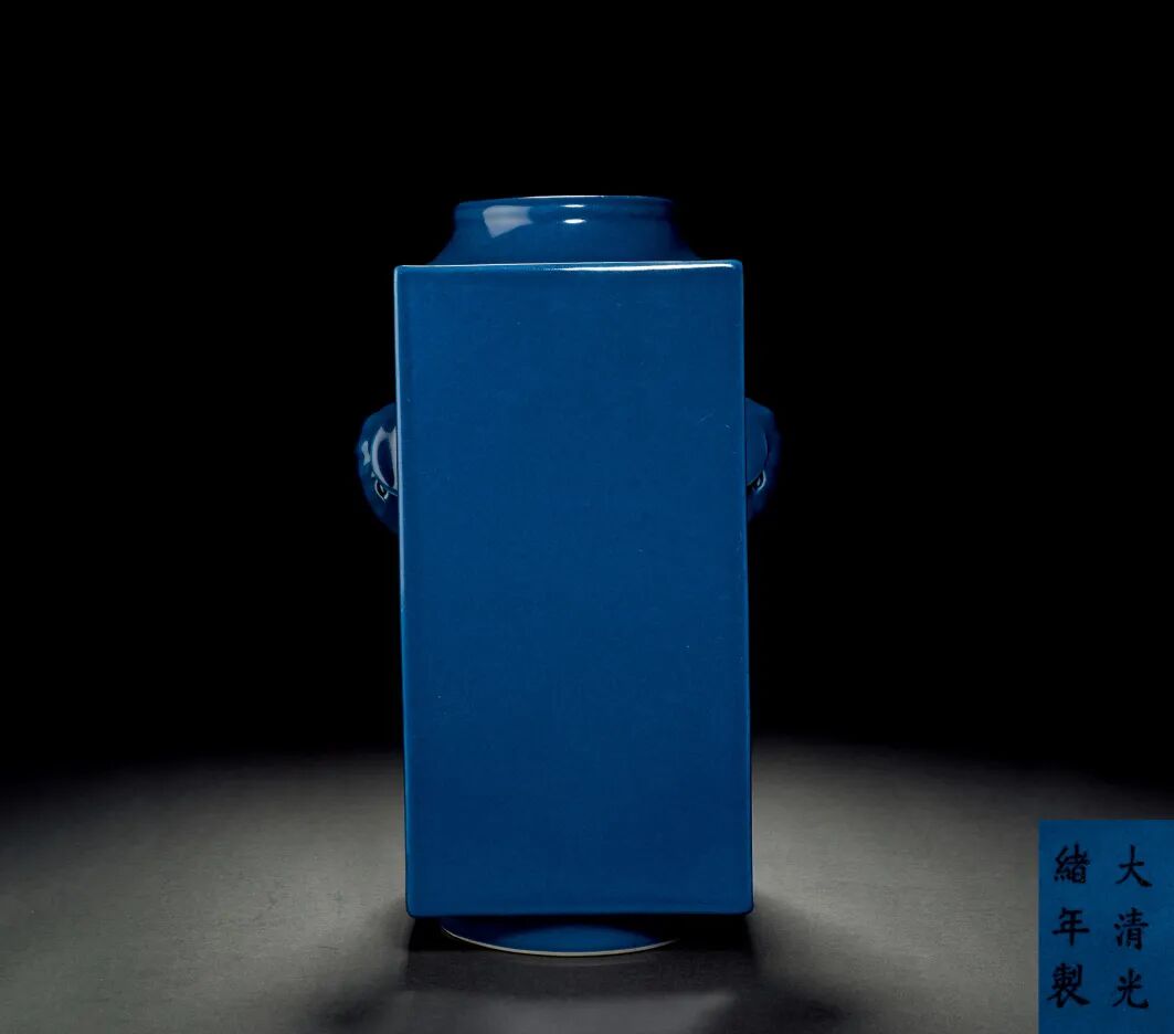 说明:本品为圆口,短颈,方肩直腹,瓶身四方,器型仿良渚文化玉琮而製,故名琮式瓶,暗合中国古代“天圆地方”之思想。琮式象耳方瓶是乾隆时期开始流行的一种瓶式,寓有四方太平有祥(象)之吉祥涵义。此瓶线条利落,简洁端庄,通体施霁蓝釉,釉色均匀浓厚,色如蓝宝石,纯美宁谧,为清代官窑单色釉的标准器。蓝釉器自明以来历朝历代都有製作,一直是宫廷祭天祭祀的用器,而单色釉为明清两代皇家专属不同颜色作不同用处,多数用为礼器,祭器,由此本拍品等级之高,不言而喻。