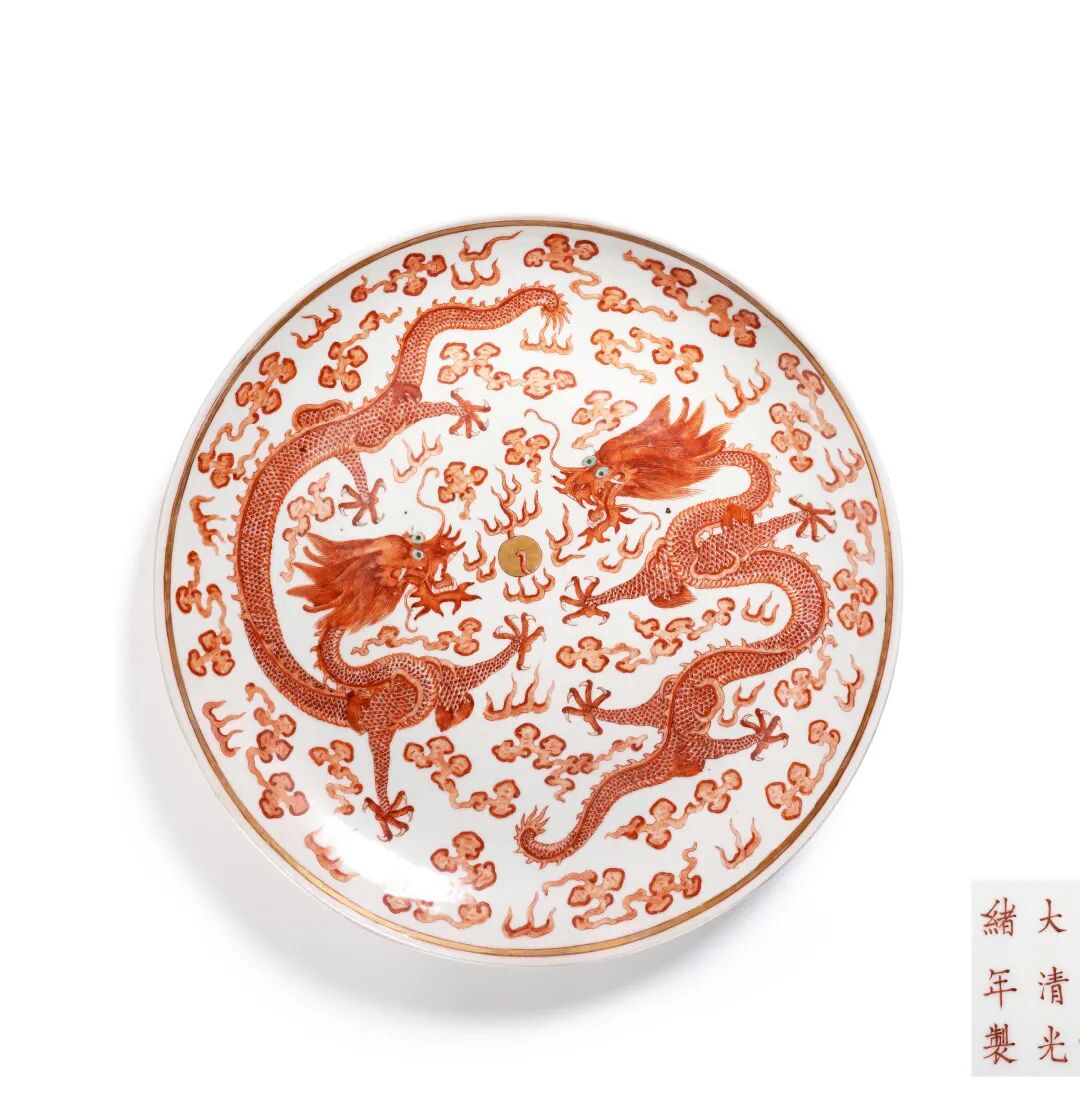 说明:本品呈敞口,弧壁,浅腹,圈足。通体施白釉,釉面光润。口沿饰金彩一周,盘心矾红彩绘双龙戏珠,并以金彩描绘龙珠,金光熠熠。双龙身形矫健,鬃鬣飞扬,鳞片历历,张牙舞爪,展现威风凛凛之态。外壁绘火焰祥云纹,及双龙戏金珠,构图疏朗,色调雅淡。底部矾红彩大清光绪年製六字楷书款。本对盘矾红色调层次丰富,色彩鲜艳,凝而不滞。而纹饰上的构图布局讲究,龙须龙鳞等细节刻划精美,龙有五爪,为九五之尊御用,其双龙周围环绕祥云火焰纹,中部饰宝珠,意表可避水火。