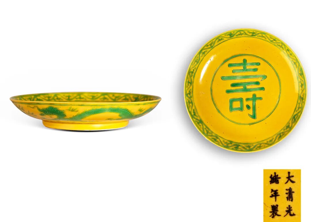 3035 清光绪 黄地绿彩寿字龙纹盘(一对)