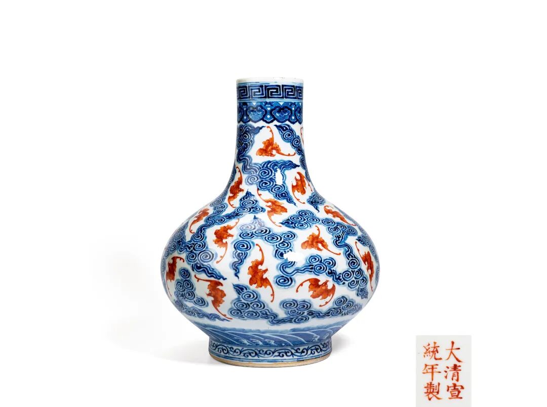 说明:青花矾红彩云蝠纹荸荠瓶为清晚期官窑经典品种,乃宫廷标准陈设用瓷,由于宣统一朝仅三年,官窑烧造数量不多,此类大尺寸器尤其少见。拍品器形规整,通体满绘纹饰,以釉下青花和釉上矾红彩描绘,自口沿向下分别为回纹、如意头纹、云蝠纹、海水纹和卷草纹。纹饰布局满密,绘工精细,青花色泽浓艳,红蝠穿梭云间,有洪福齐天之吉祥寓意。品相保存良好。