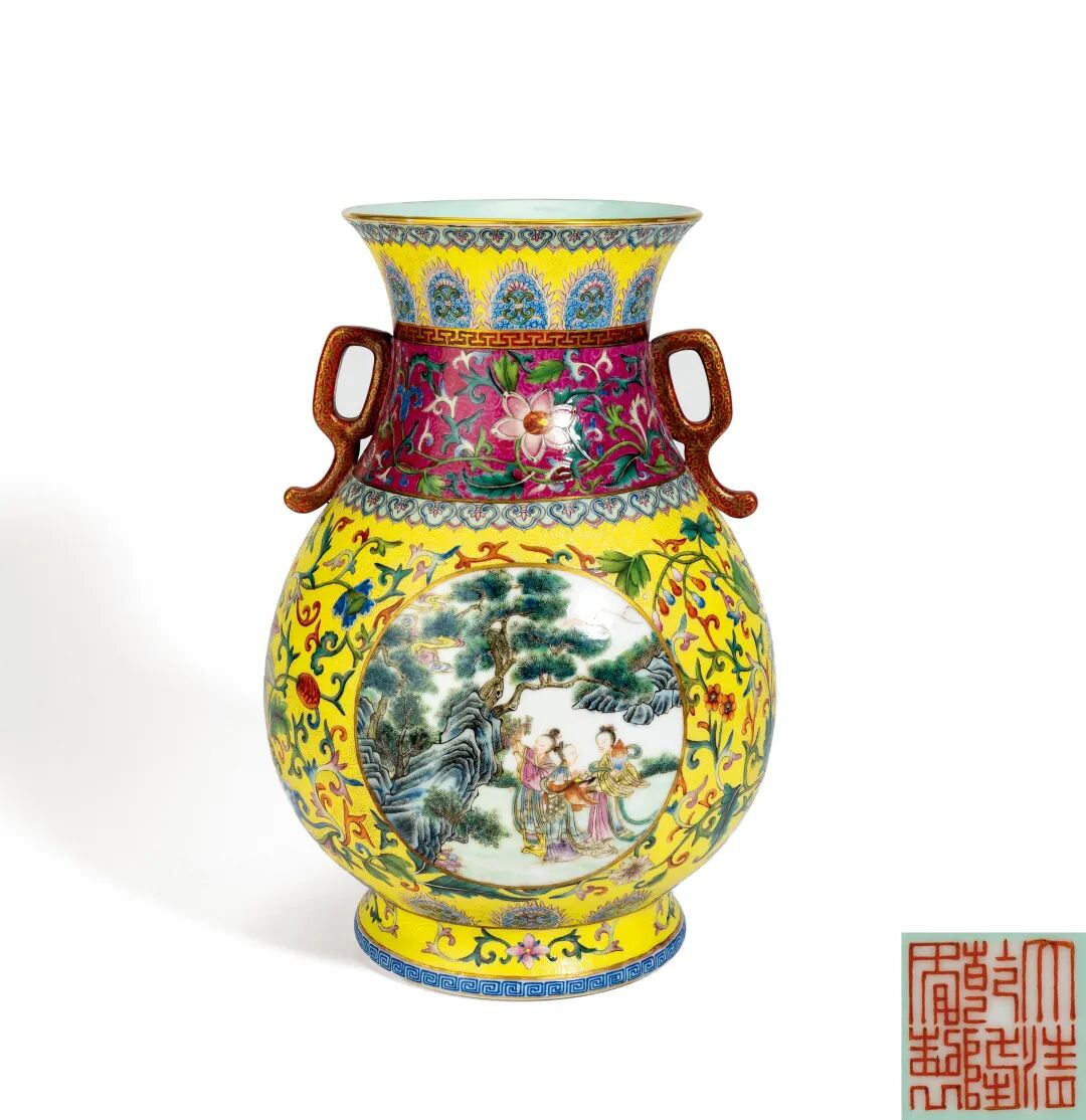 说明:此件黄地轧道粉彩花卉开光人物故事双耳瓶,器型十分俊美,通体施轧道粉彩,前后两处开窗内施以白釉,绘制人物故事,绘制精细,规矩有度,颇具风骨,雅致清新,釉色洁白温润,口沿、足部分别饰如意云头纹、等作边饰,颈部与腹部非开窗处满绘折枝花卉,鲜艳动人,娇嫩匀净,衔接自然,蜿蜒曼妙,施彩明艳妍丽,线条流畅,突显神韵,赏心悦目。颈部两侧瓷塑双耳。拍品绘画功力非凡,十分精湛,人物刻画栩栩如生,粉彩绚丽多彩,即便与乾隆官器相比亦毫不逊色,值得珍藏。