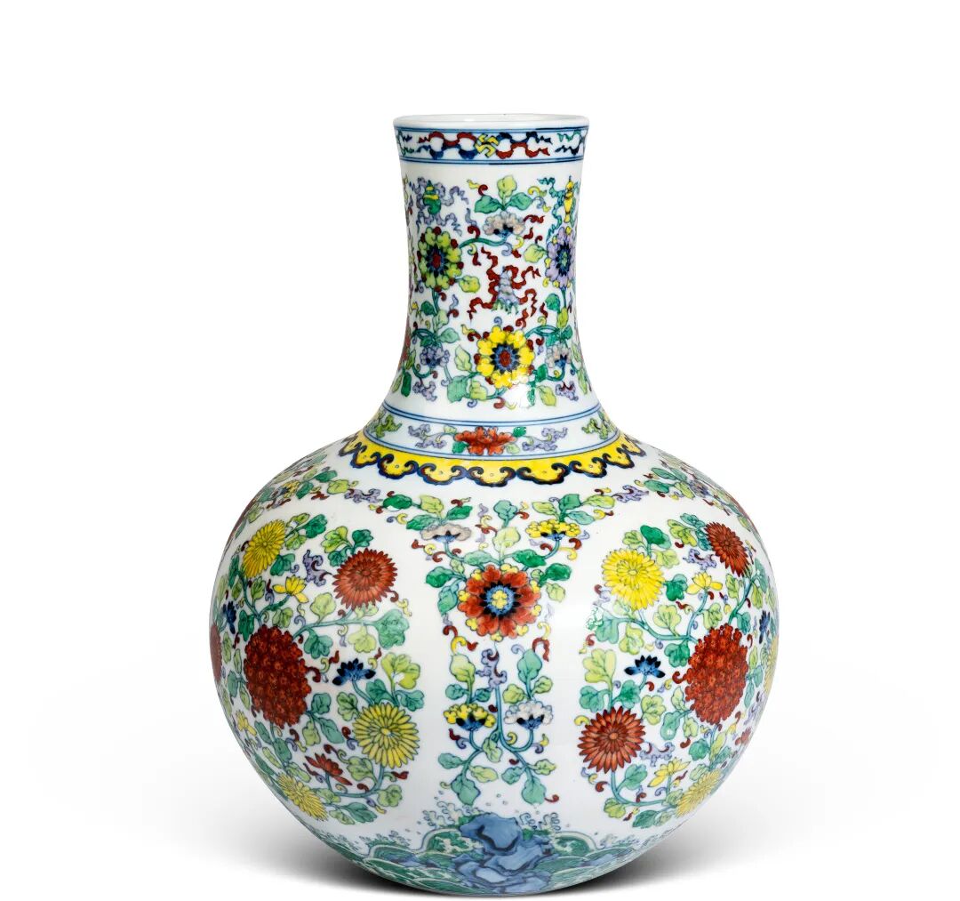 天球瓶创烧于永宣,因圆球腹硕大,如从天降,故名「天球」。雍乾两朝盛世,仿古之风盛行,仿造天球瓶属宫廷大型陈设用瓷,其品种有青花,五彩,粉彩,最为珍贵的斗彩却很少应用于天球瓶上,其因为「斗彩无大器」,弘历极爱珍瓷雅器,于是天球瓶这一斗彩大器便奉旨得以烧造,本品便是一难得之例。
